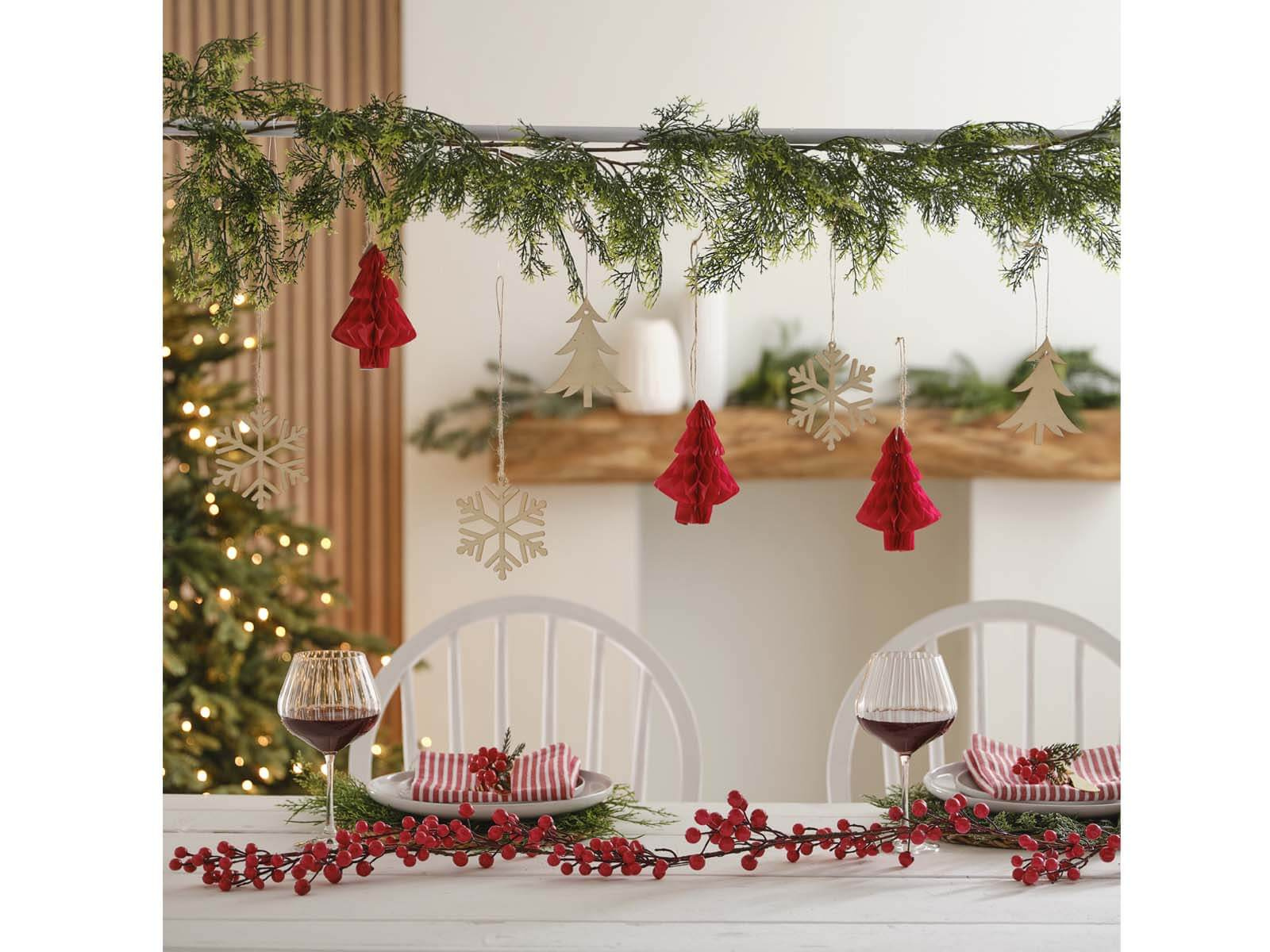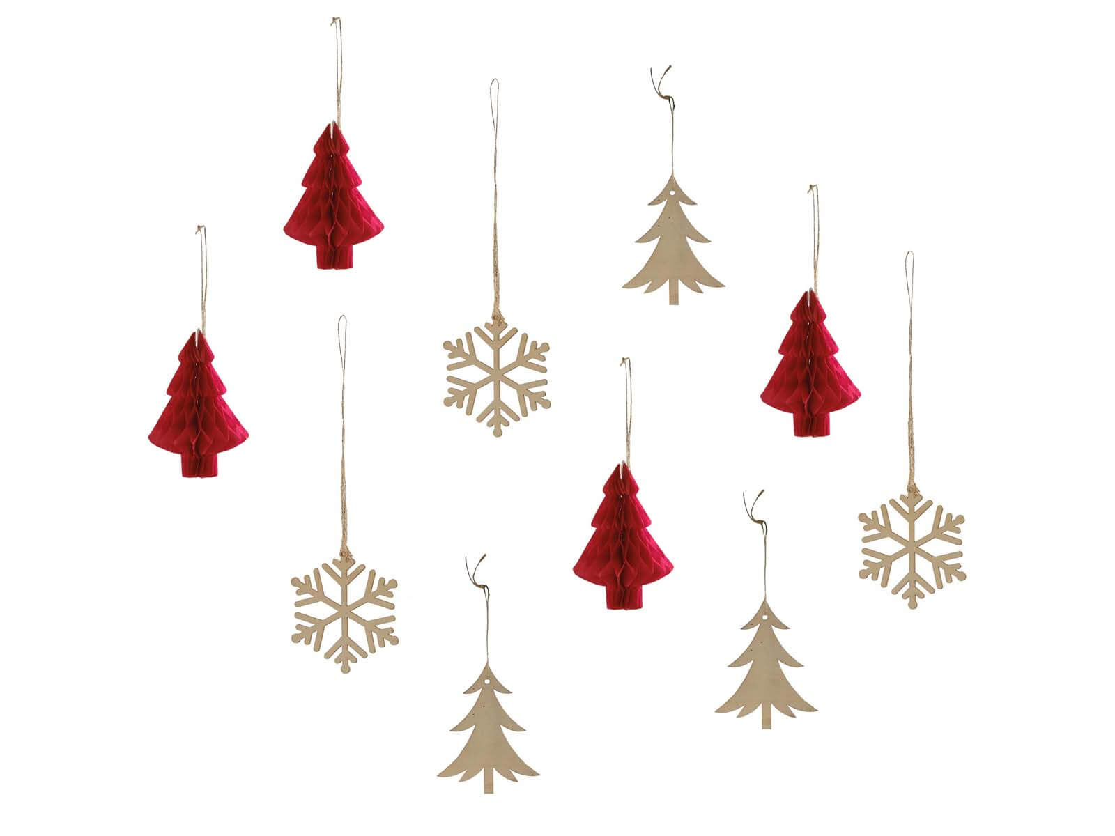Przemień swoją choinkę w świąteczną sensację z naszym zestawem zawieszek. W skład zestawu wchodzą drewniane choinki i śnieżynki oraz czerwone rozetki, które doskonale komponują się ze świąteczną atmosferą. Ciekawe tekstury i kolory tych ozdób dodadzą uroku każdej choince.