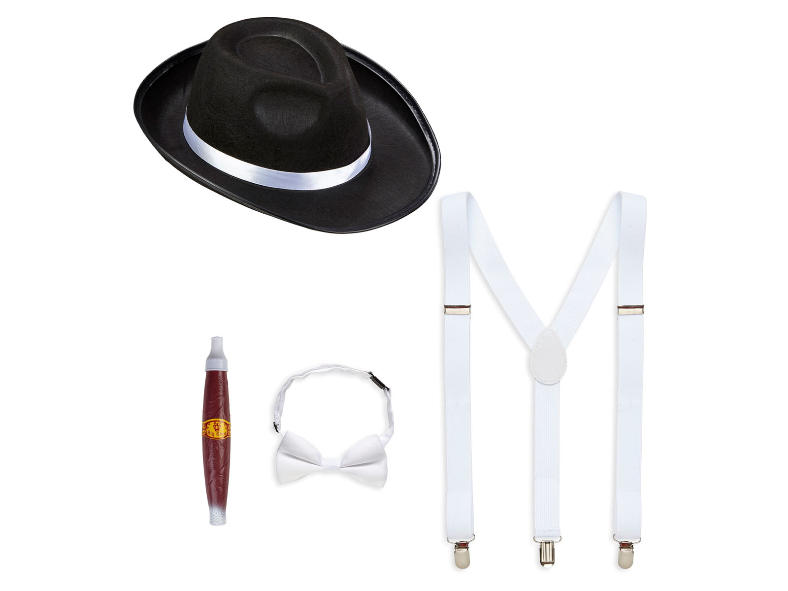 W skład zestawu wchodzi elegancki kapelusz w stylu retro, który doda każdemu mężczyźnie dystynkcji i tajemniczości. Szelki i muszka podkreślą elegancję i stylowy charakter stroju. Aby dodać autentyczności, do zestawu dołączono także cygaro - nieodłączny atrybut każdego szanującego się gangstera tamtych czasów.