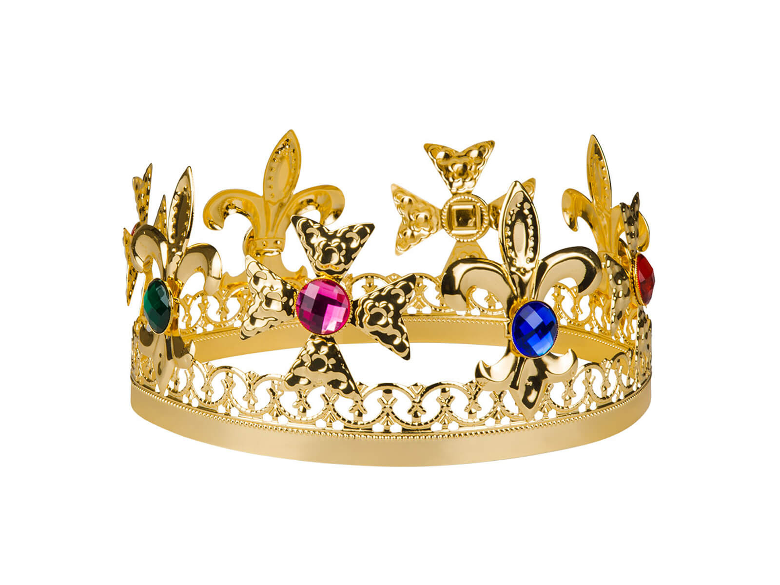 Prezentujemy Koronę Króla, która jest niezbędnym atrybutem każdej królewskiej postaci. Wykonana z metalu w imponującym złotym kolorze, ozdobiona jest kolorowymi klejnotami, które przyciągają wzrok i dodają majestatu.