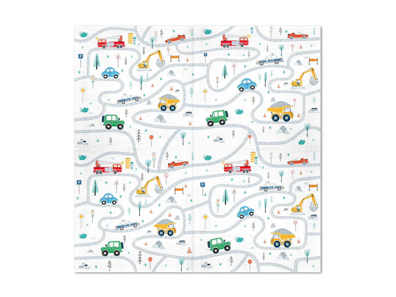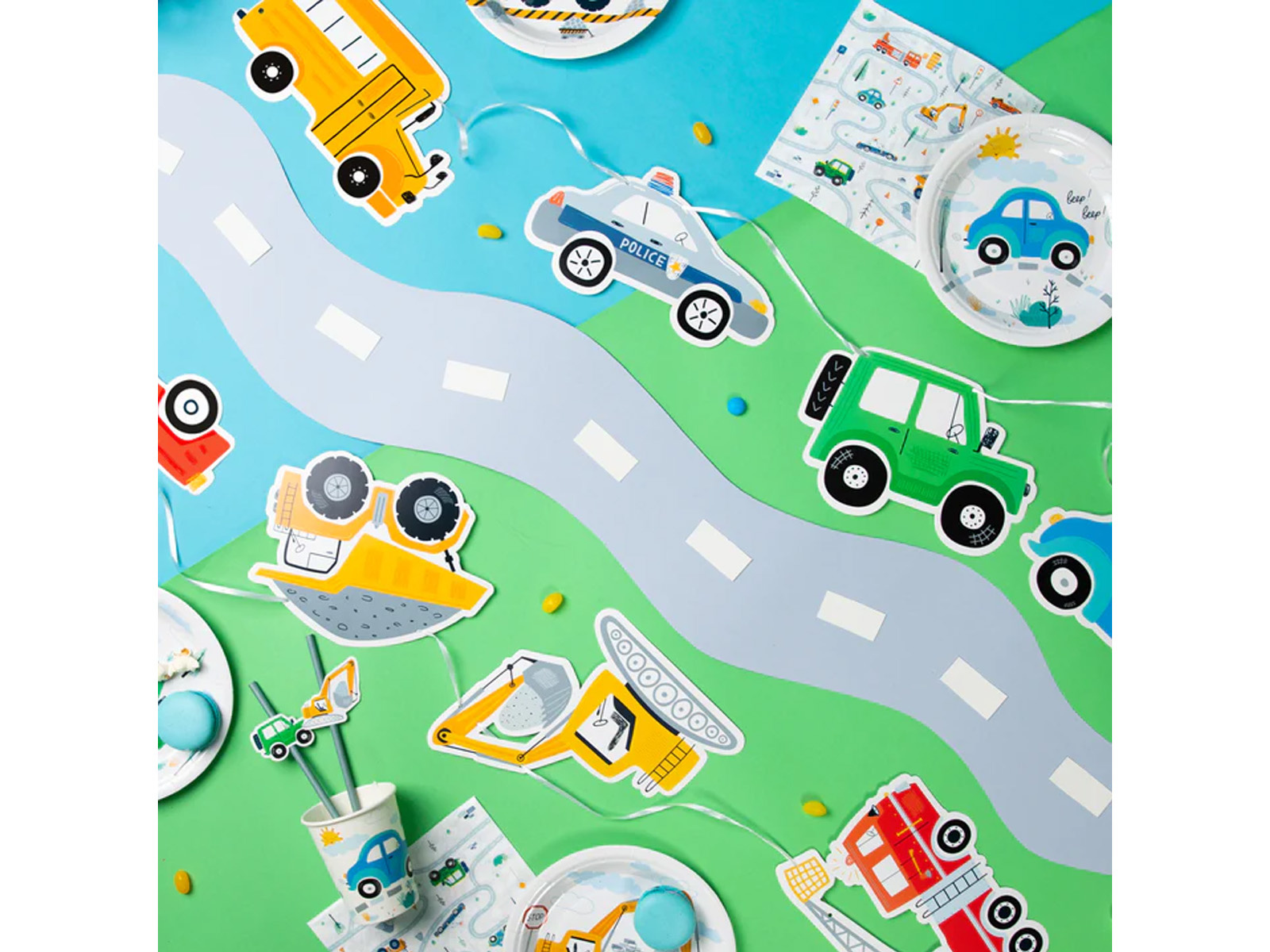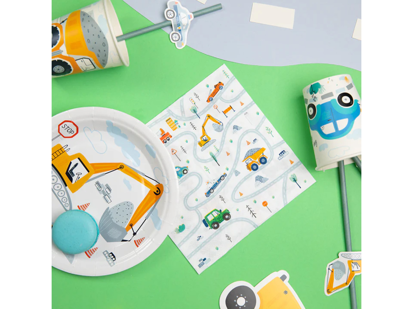 Zaplanuj wyjątkową urodzinową imprezę dla swojego dziecka z naszymi kolorowymi serwetkami z motywem aut! Każda serwetka zdobiona jest ilustracjami różnych pojazdów takich jak jeep, garbus, wóz strażacki, radiowóz, wywrotka i koparka, co z pewnością przyciągnie uwagę małych miłośników motoryzacji.