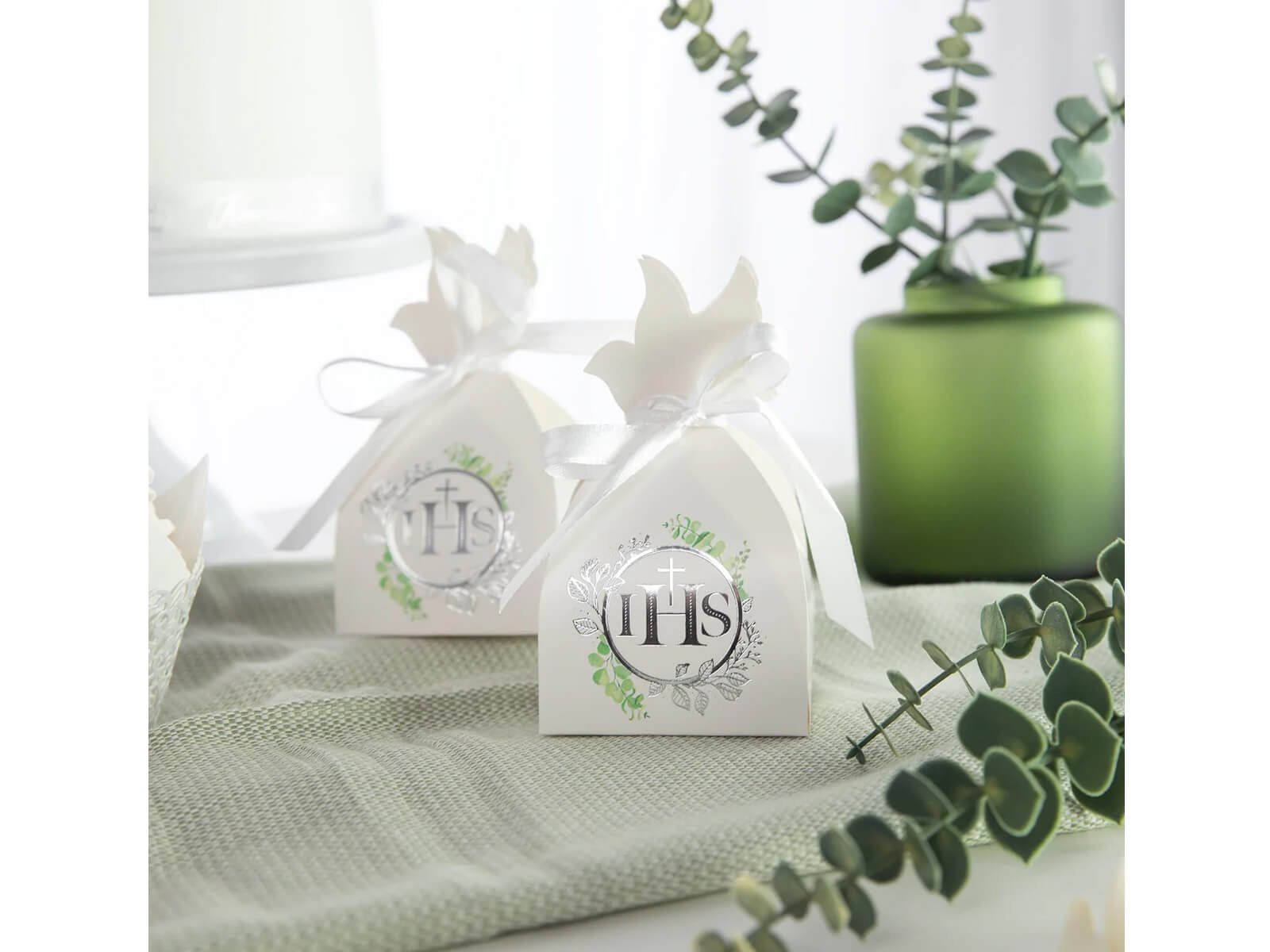 Pudełeczka dla gości na Komunię Świętą z eukaliptusem - 6 szt.