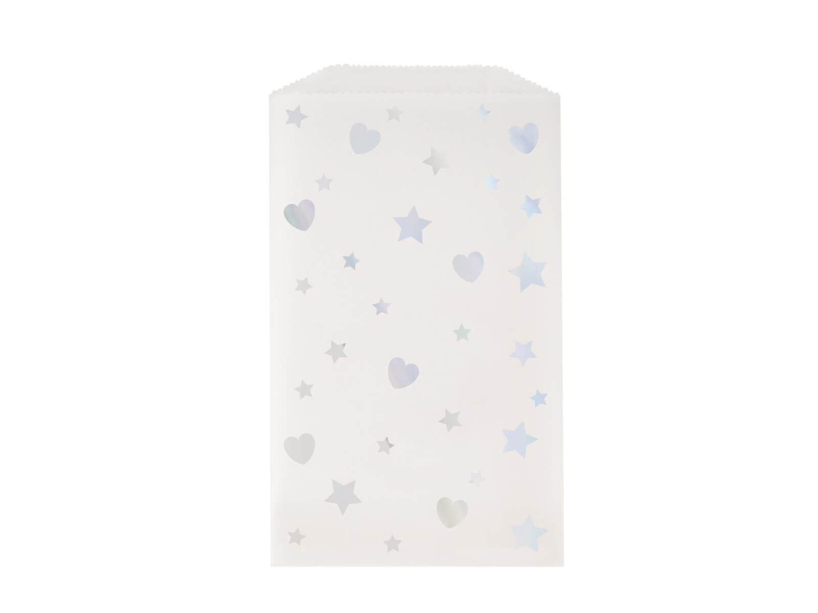 Torebki na słodycze białe w srebrne gwiazdki i serca - 8 szt.