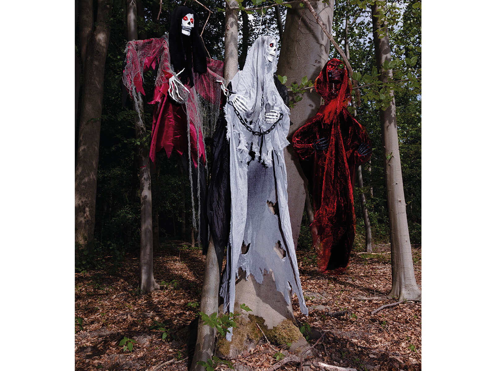 Podnieś atmosferę strachu na swoim przyjęciu Halloween z naszą dekoracją wiszącą Szkielet w Łańcuchach. Ta imponująca dekoracja ma długość aż 180 cm i wzbogacona jest o szarą szatę, która dodaje jej tajemniczego wyglądu. Szkielet jest zawieszony na łańcuchach, co sprawia, że idealnie komponuje się w mrocznym klimacie Halloween.