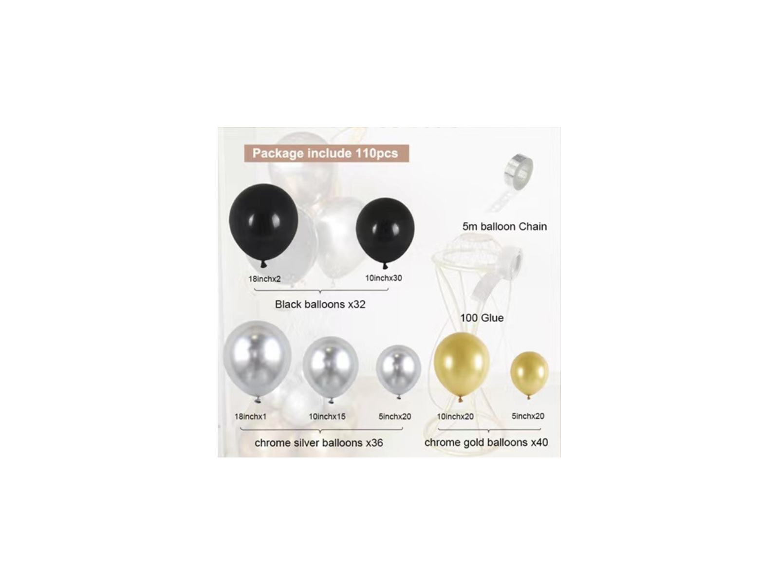 Zestaw balonów do girlandy balonowej czarno-srebrno-złoty - 108 szt.