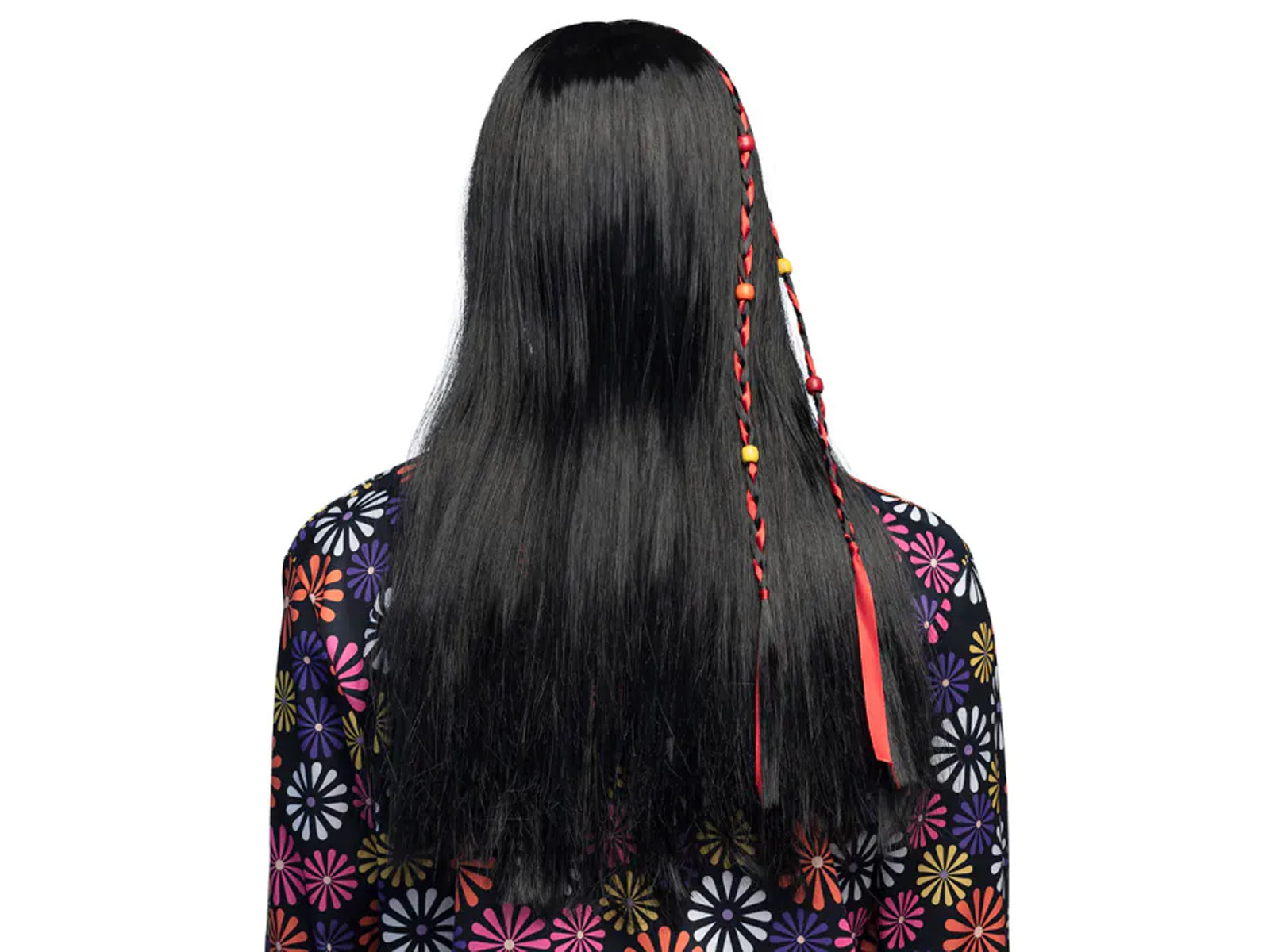 Przenieś się w czasie do ery miłości i pokoju z naszą stylową "Peruką Hippisa z Warkoczykami". Idealna dla każdego, kto chce dodać autentyczny akcent do swojego kostiumu hippisa, ta peruka charakteryzuje się długimi, prostymi czarnymi włosami, uzupełnionymi o urokliwe warkoczyki zdobione koralikami. Załóż ją na karnawał, imprezę kostiumową czy inne specjalne okazje i bądź pewien, że przyciągniesz uwagę wszystkich wokół.
