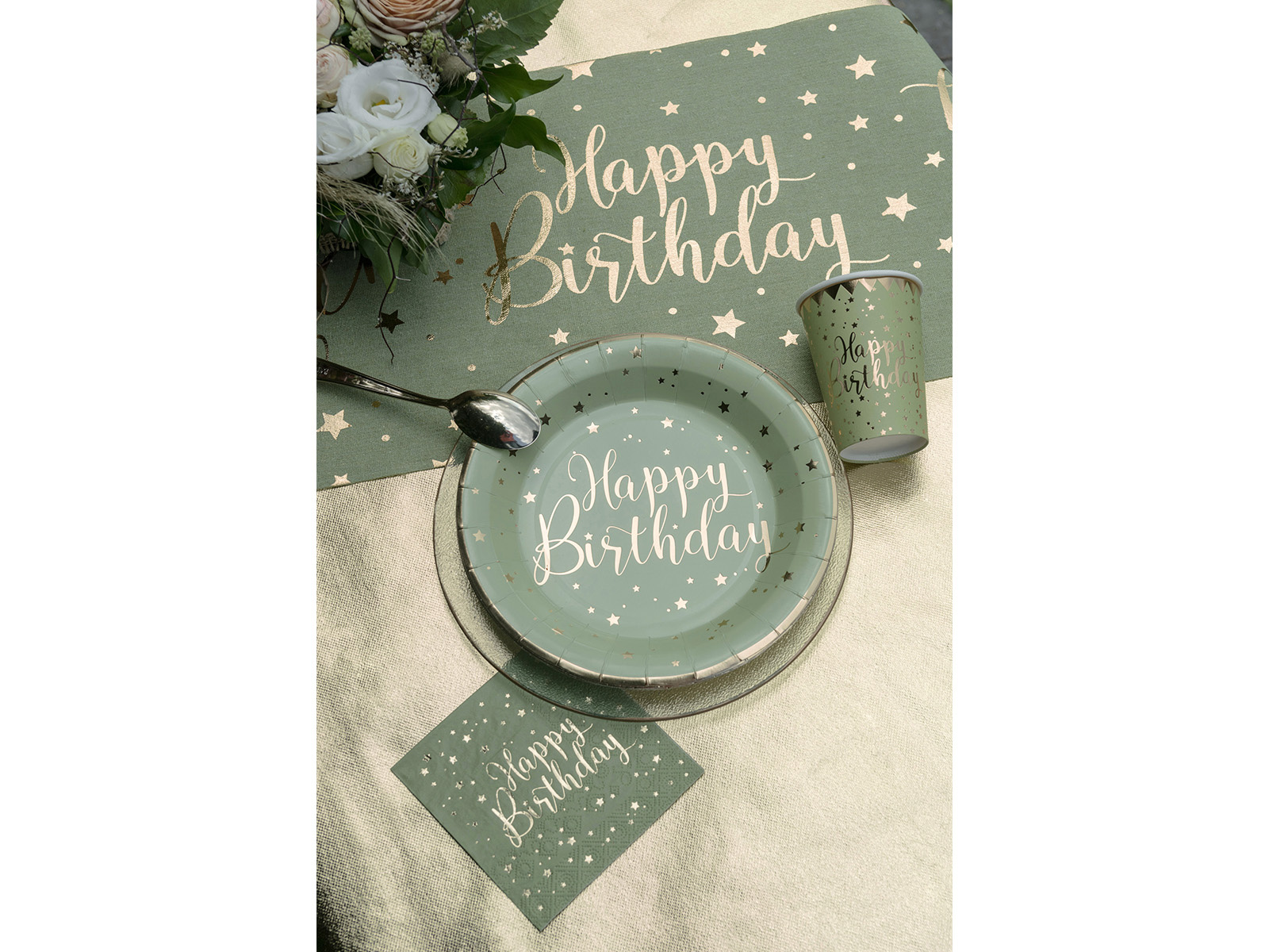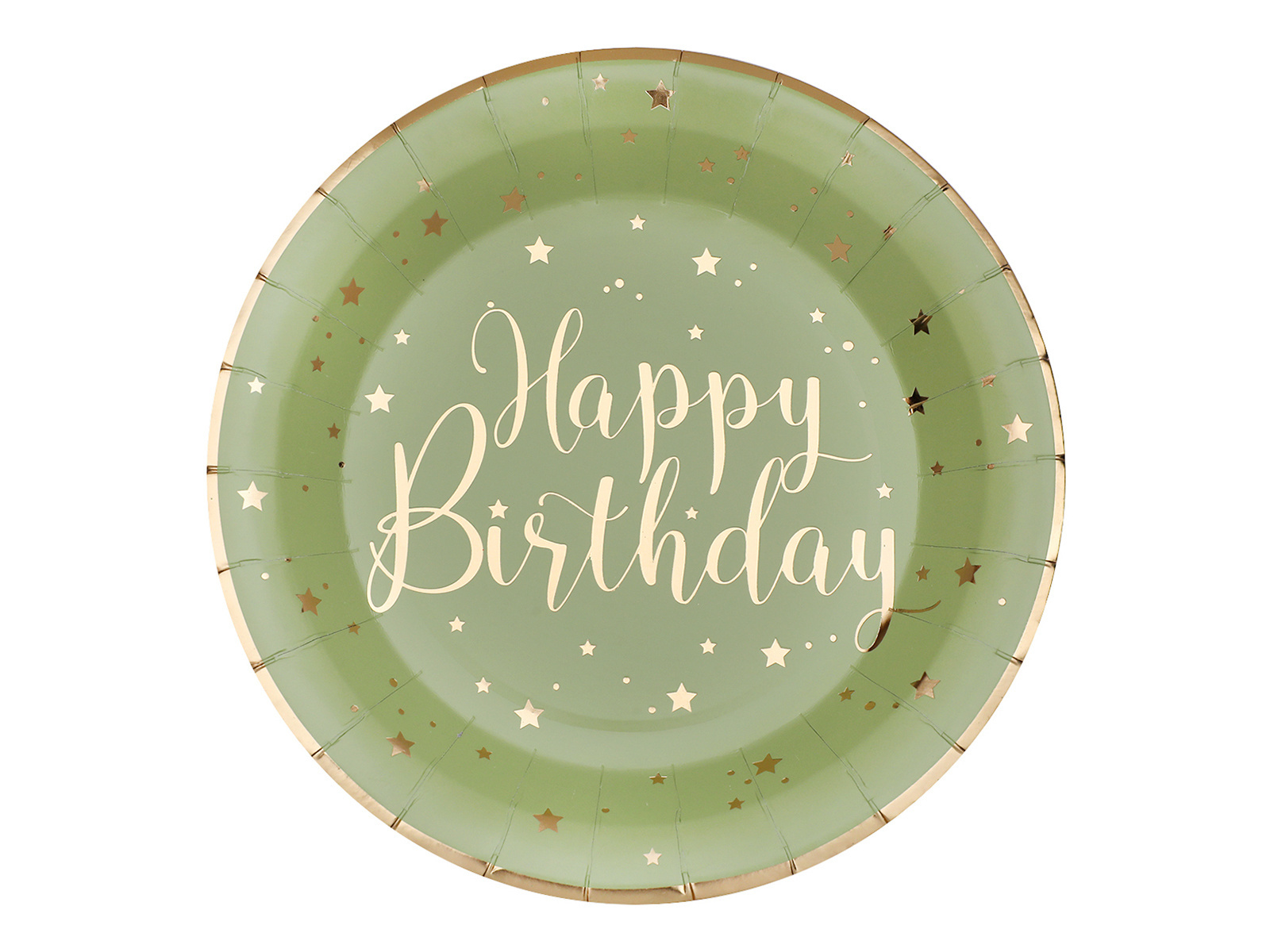 Talerzyki papierowe na urodziny oliwkowe Happy Birthday - 22,5 cm - 10 szt.