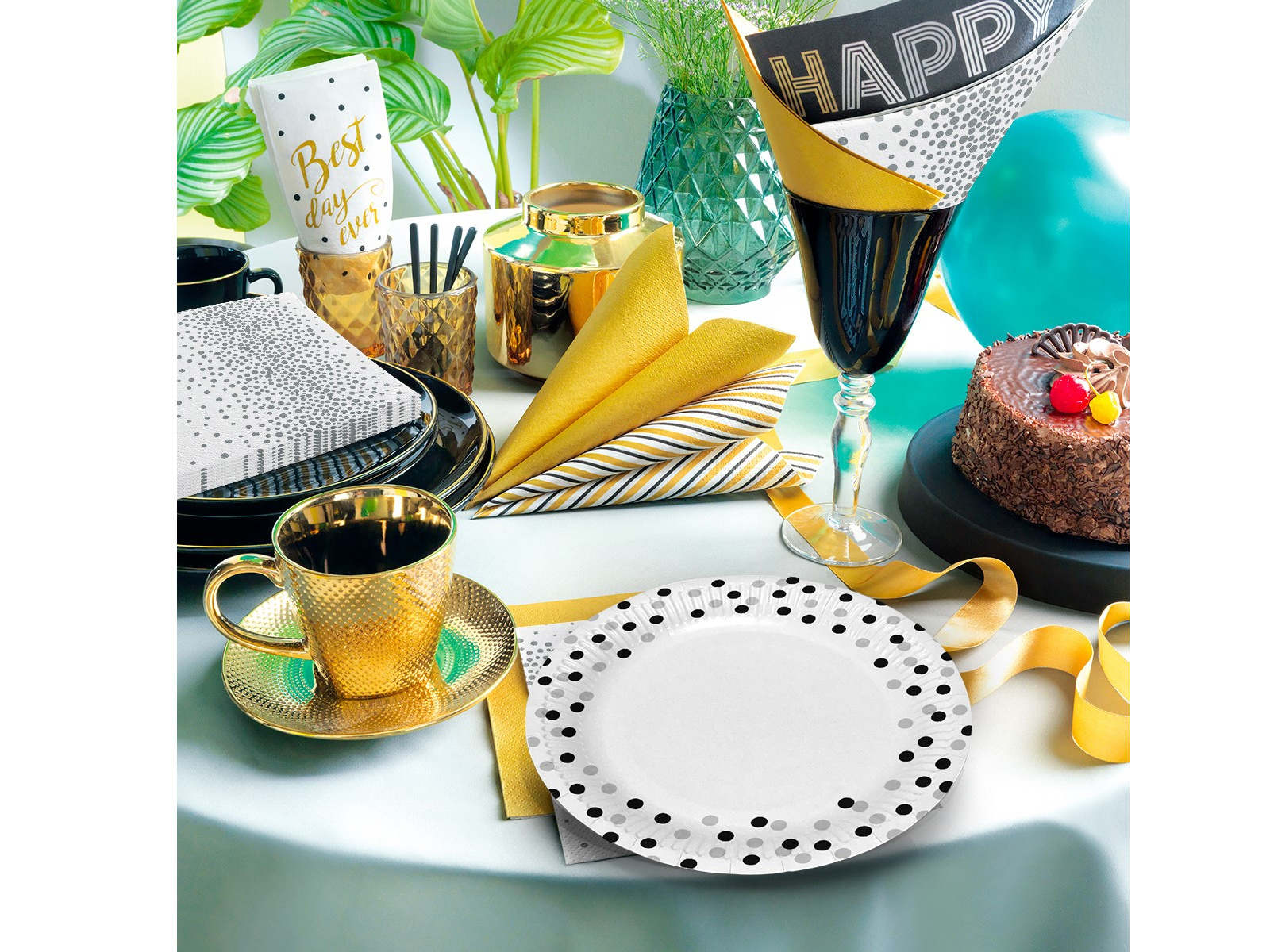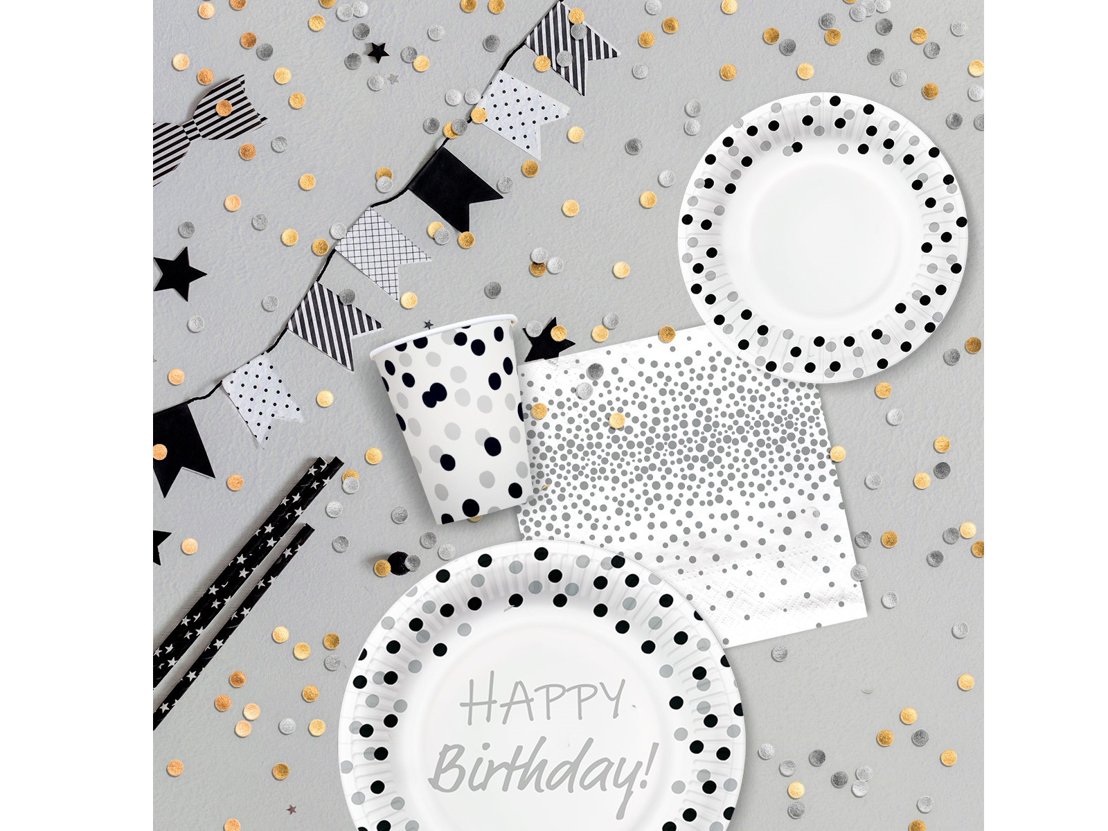 Talerzyki papierowe na urodziny Konfetti srebrno-czarne - 18 cm - 8 szt.