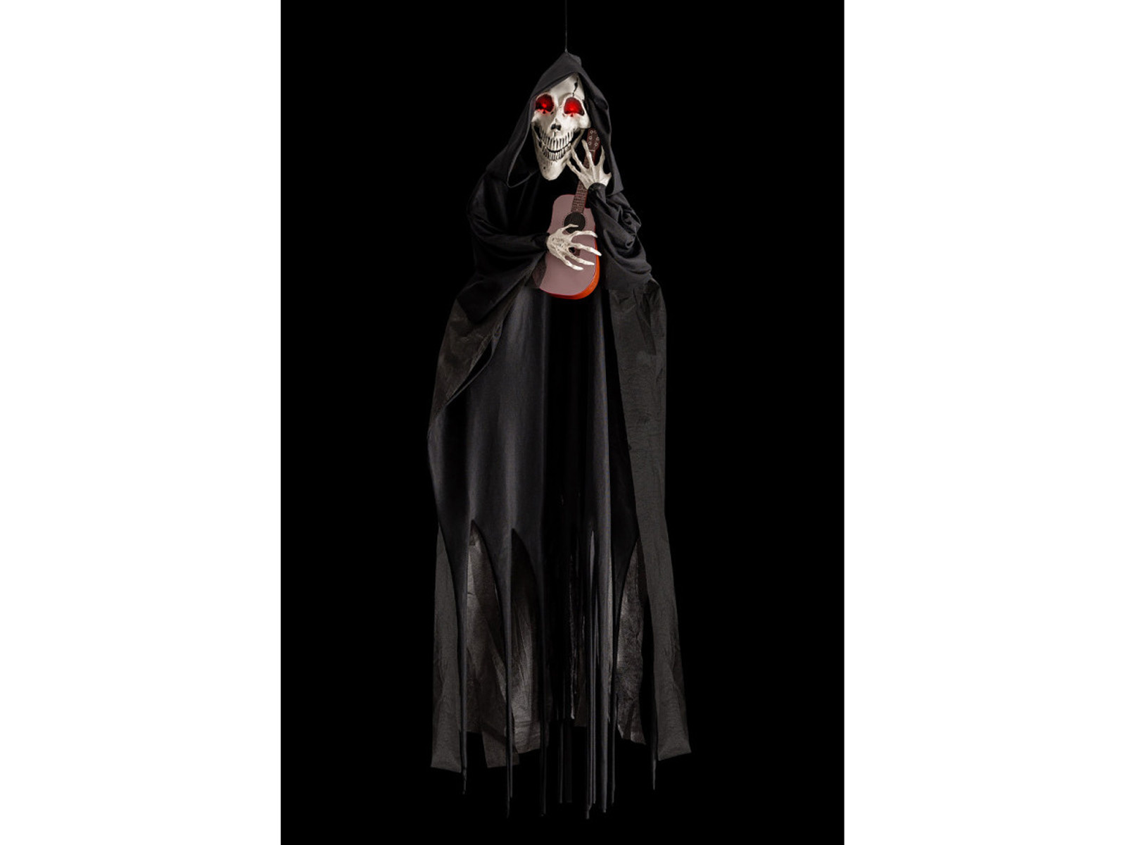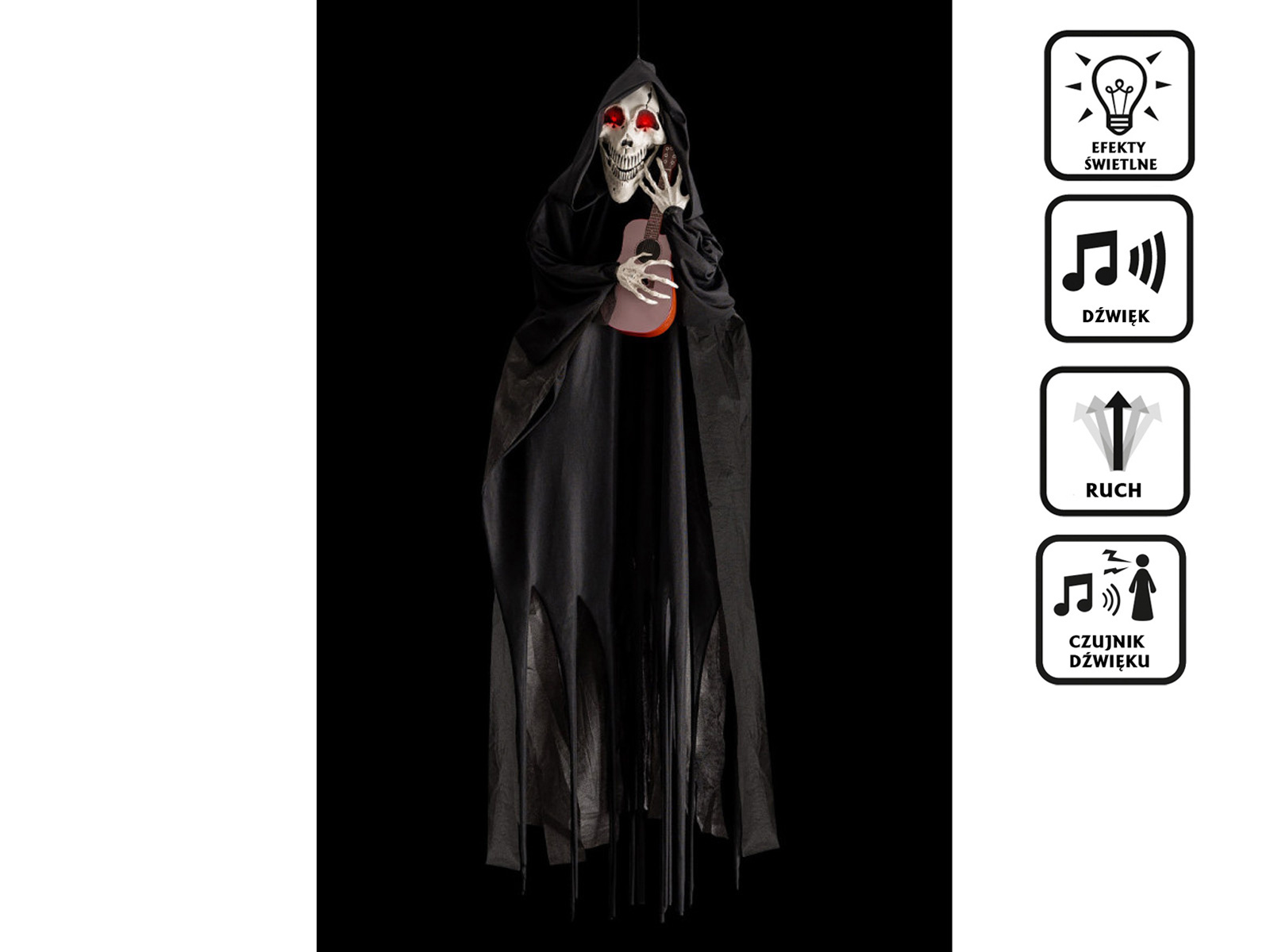 Szkielet jest nie tylko przerażająco realistyczny, ale też interaktywny – jego oczy świecą w mroku, porusza się, a z jego wnętrza dobiegają elektryzujące dźwięki gitary elektrycznej. Zasilanie na baterie umożliwia łatwe umieszczenie dekoracji w dowolnym miejscu, bez potrzeby dołączania do prądu, co jest szczególnie praktyczne w dekorowaniu rozmaitych przestrzeni.