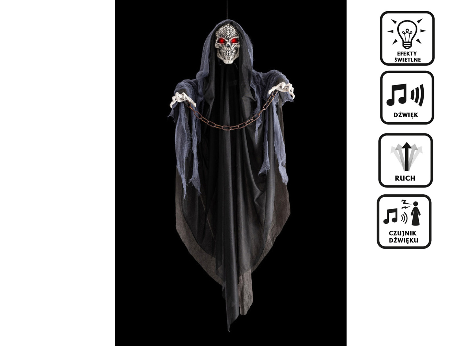 Dzięki wysokości 120 cm, szkielet jest znakomicie widoczny i może stać się główną atrakcją Twojej dekoracji. Pozwala na łatwe zawieszenie w dowolnym miejscu, zarówno wewnątrz, jak i na zewnątrz pomieszczeń. Zintegrowany mechanizm poruszania się dodatkowo potęguje wrażenie grozy.