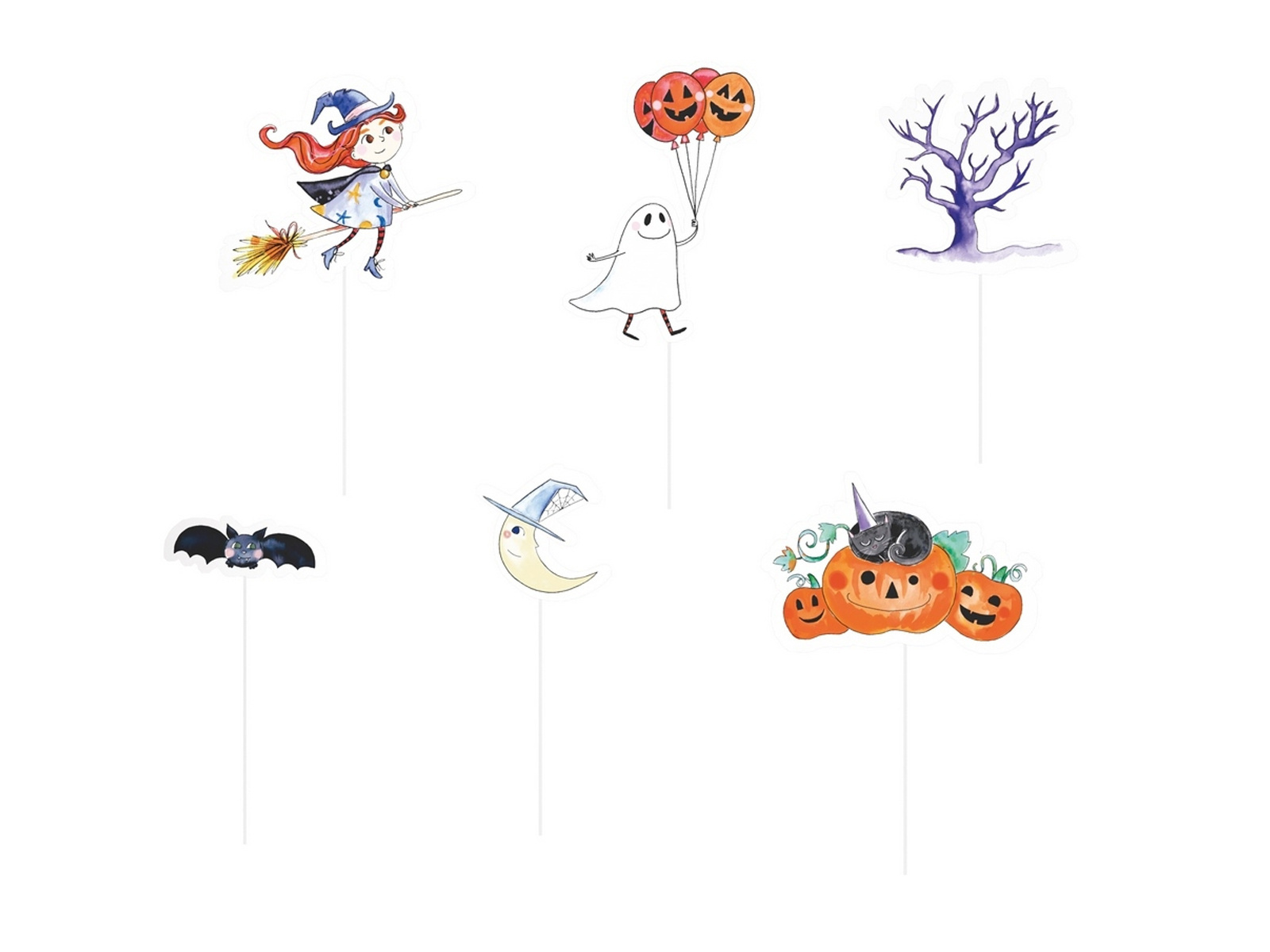 Przemień zwykłe wypieki w magiczną ucztę z pikery na babeczki Mała Wiedźma. Ten zestaw zawiera 6 unikalnych, dwustronnych dekoracji, które dodadzą charakteru każdej halloweenowej imprezie. W skład zestawu wchodzą papierowe pikery z motywami czarownicy, ducha z balonikami, strasznego drzewa, nietoperza, księżyca oraz dyni z czarnym kotem.