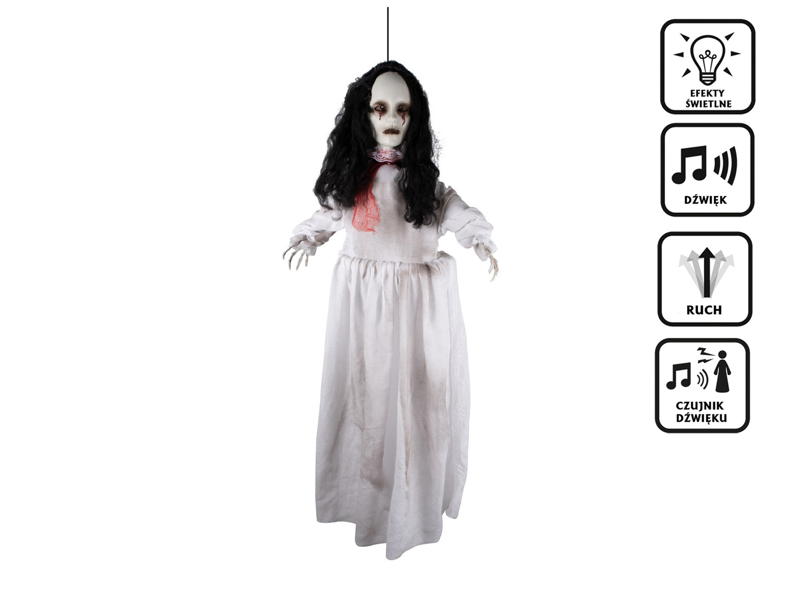 Zapraszamy do świata dreszczowców z naszą dekoracją "Zjawa", której złowieszczy uśmiech i niebieskie światło dodadzą tajemniczości każdemu Halloween! Ta wisząca figura ducha idealnie sprawdzi się jako centralny element dekoracyjny na spooktakularne przyjęcie. Z efektem ruchu - obniżająca się i podnosząca tułów - oraz przerażającym śmiechem, ta zjawa stanie się hitem każdej imprezy.