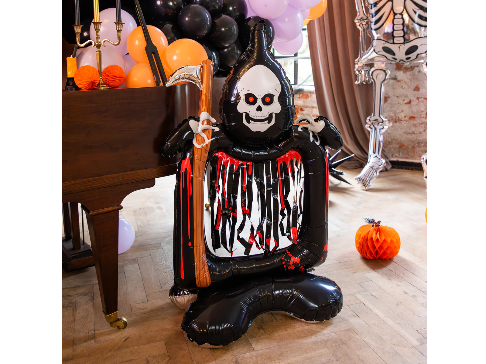 Rzuć strach na swoich gości przy użyciu naszego imponującego balonu foliowego przedstawiającego Śmierć z Kosą! Perfekcyjna dekoracja na każde przyjęcie z okazji Halloween, a także doskonały dodatek do tematycznego wystroju. Wymiary balonu to 69 x 46 x 125 cm, co sprawia, że jest dużym, ale zarazem praktycznym elementem dekoracyjnym.