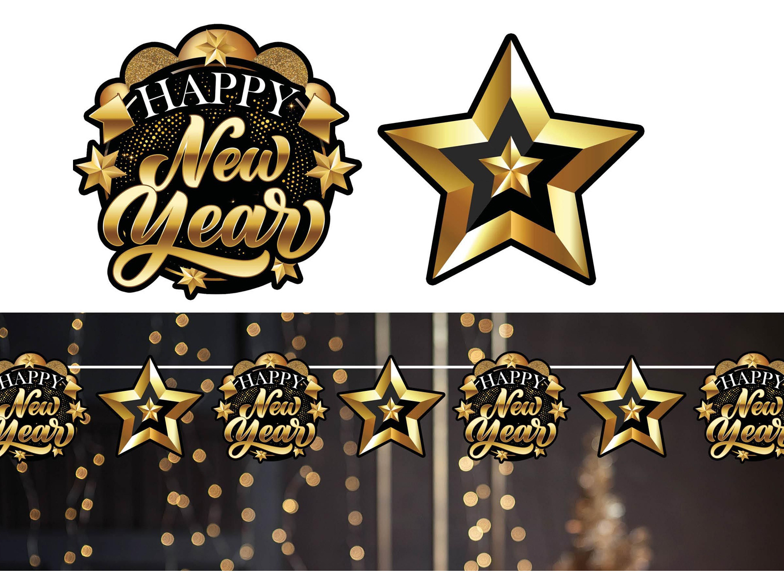 Przemień swoje przyjęcie sylwestrowe w spektakularne wydarzenie z naszą papierową girlandą Gwiazdki Happy New Year! Ta elegancka dekoracja o długości 300 cm stanowi idealne tło dla noworocznych zabaw. Zawieszki w kształcie gwiazdek (16 x 16 cm) dodadzą blasku każdemu pomieszczeniu, a centralny ornament z napisem "Happy New Year" podkreśli tematykę wieczoru.