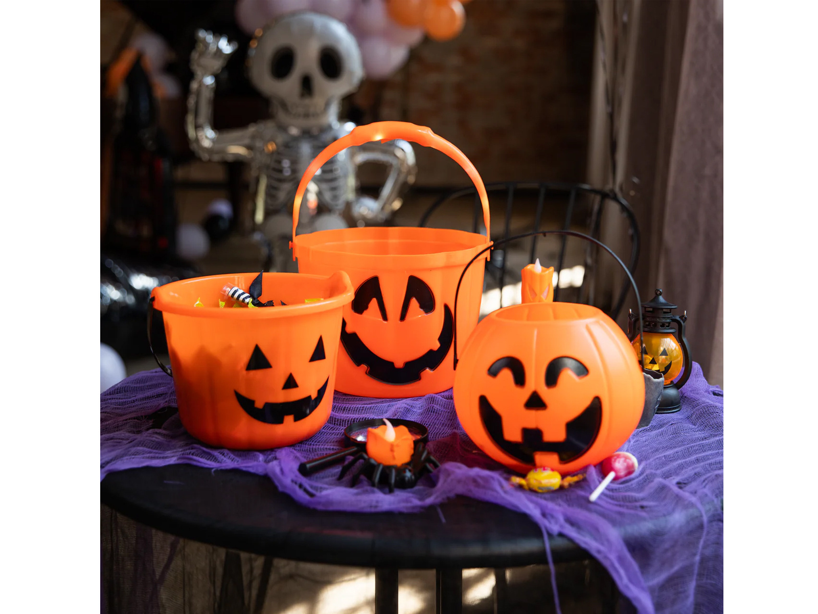 Podaruj swoim dzieciom idealne akcesorium na Halloween z tym uroczym wiaderkiem w kształcie dyni. Wykonane z wytrzymałego plastiku, nie tylko świetnie sprawdzi się podczas zbierania słodyczy, ale również może posłużyć jako oryginalna ozdoba. Intensywnie pomarańczowy kolor, z pewnością przyciągnie uwagę.