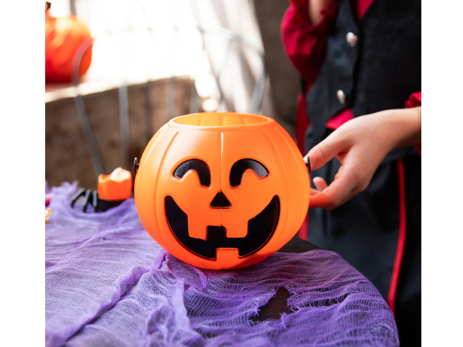 Przywitaj Halloween z tym uroczym, pomarańczowym wiaderkiem w kształcie dyni! Wykonane z trwałego plastiku, jest idealne do zbierania i przechowywania cukierków podczas słodkiego lub psikusowego obchodu. Wiaderko ma średnicę 16 cm oraz wysokość 20 cm, natomiast jego wysokość bez rączki wynosi 12 cm, co ułatwia małym rączkom chwytanie i noszenie pełnego pojemnika.