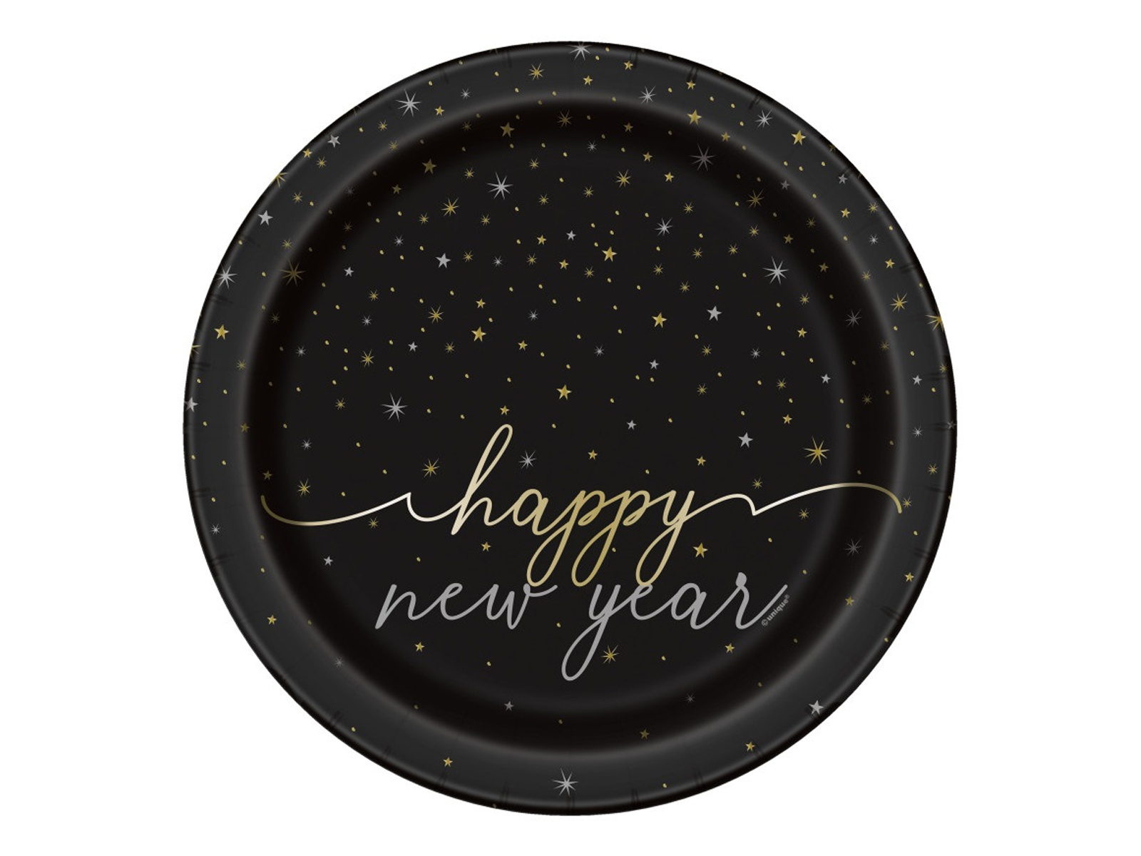 Powitaj nowy rok w wyjątkowym stylu! Zestaw 8 papierowych talerzyków Happy New Year Disco to niezbędny element każdej sylwestrowej imprezy. Wykonane z wysokiej jakości materiałów, talerzyki dekorowane są w eleganckich, czarnych odcieniach z błyszczącymi złotymi i srebrnymi gwiazdkami, które dodają blasku każdej dekoracji stołu.