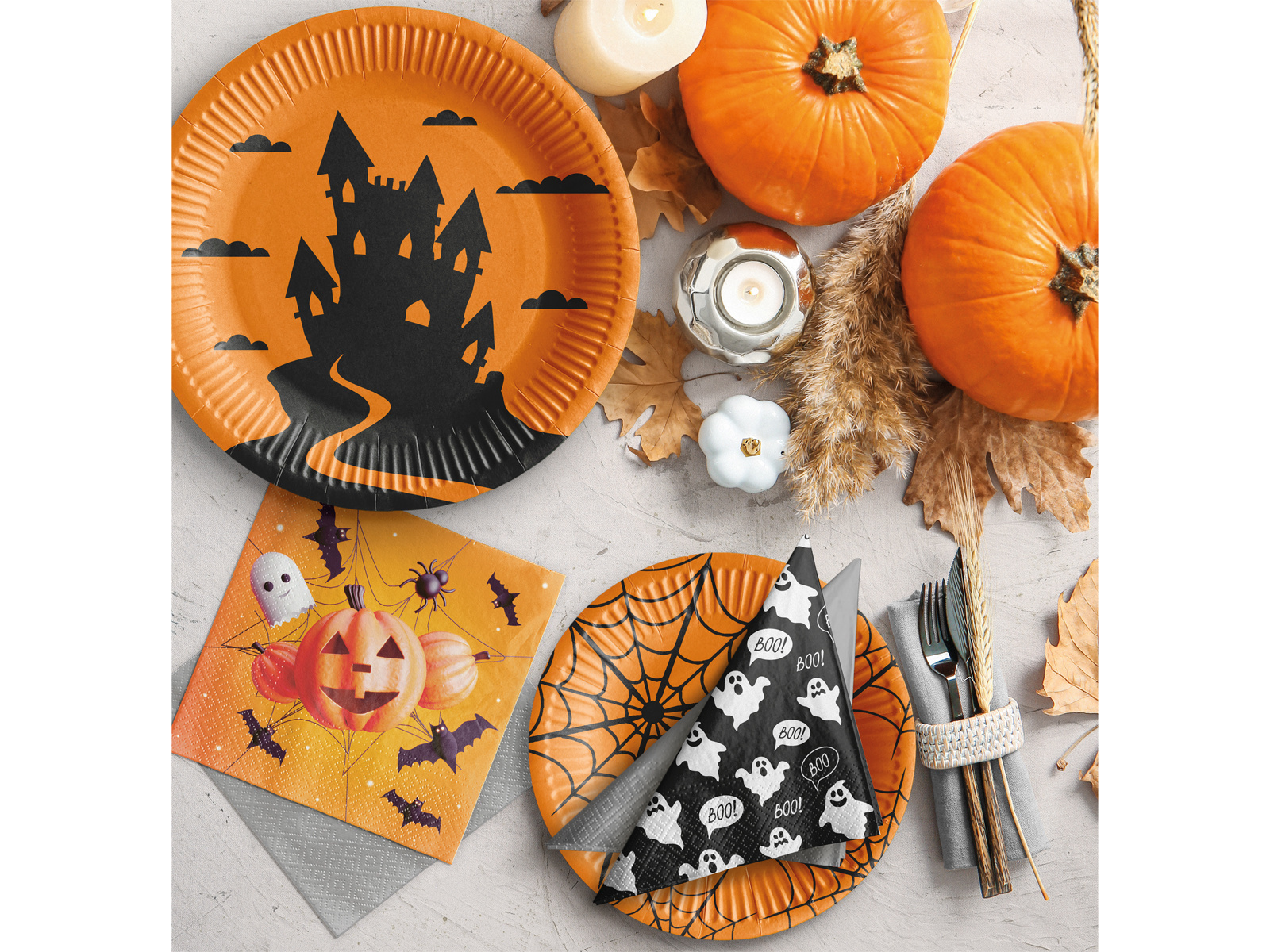 Główną atrakcją jest motyw dyni, które są głównym symbolem Halloween. Wyraziste kolory i szczegółowe rysunki dodadzą uroku każdemu stołowi, na którym się znajdą.