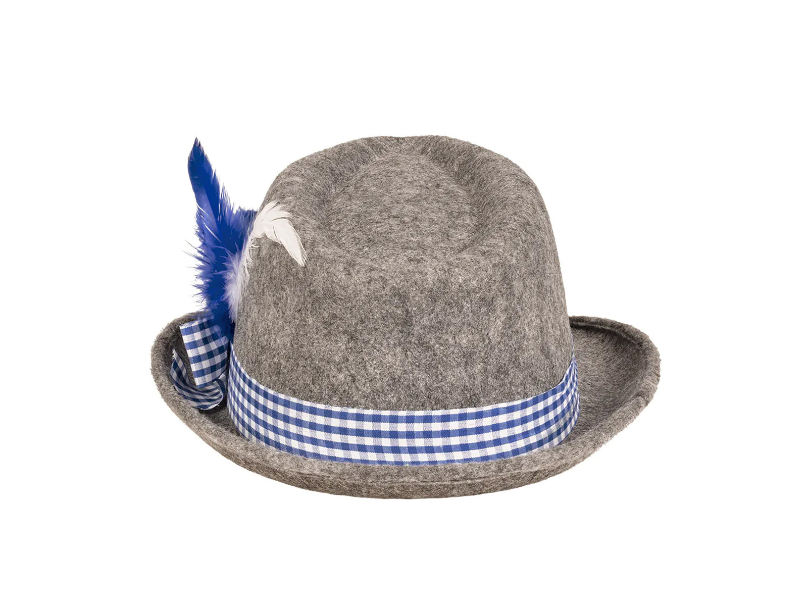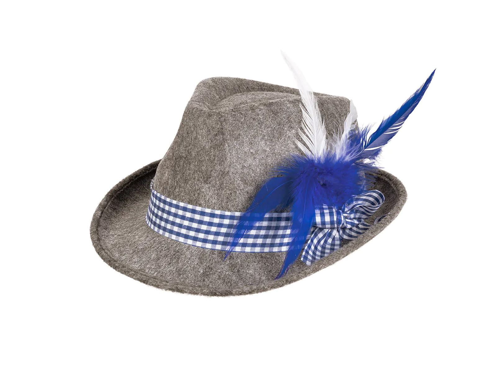 Zachwyć wszystkich wyjątkowym kapeluszem tyrolskim, który idealnie sprawdzi się jako dodatek do Twojego stroju na Oktoberfest! Ten stylowy kapelusz w odcieniu szarego jest ozdobiony charakterystyczną lamówką w biało-niebieską kratkę. Dodatkowym akcentem, który przyciąga wzrok, jest elegancka kokardka oraz efektowne niebieskie piórka, dodające kapeluszowi wyrazistości.