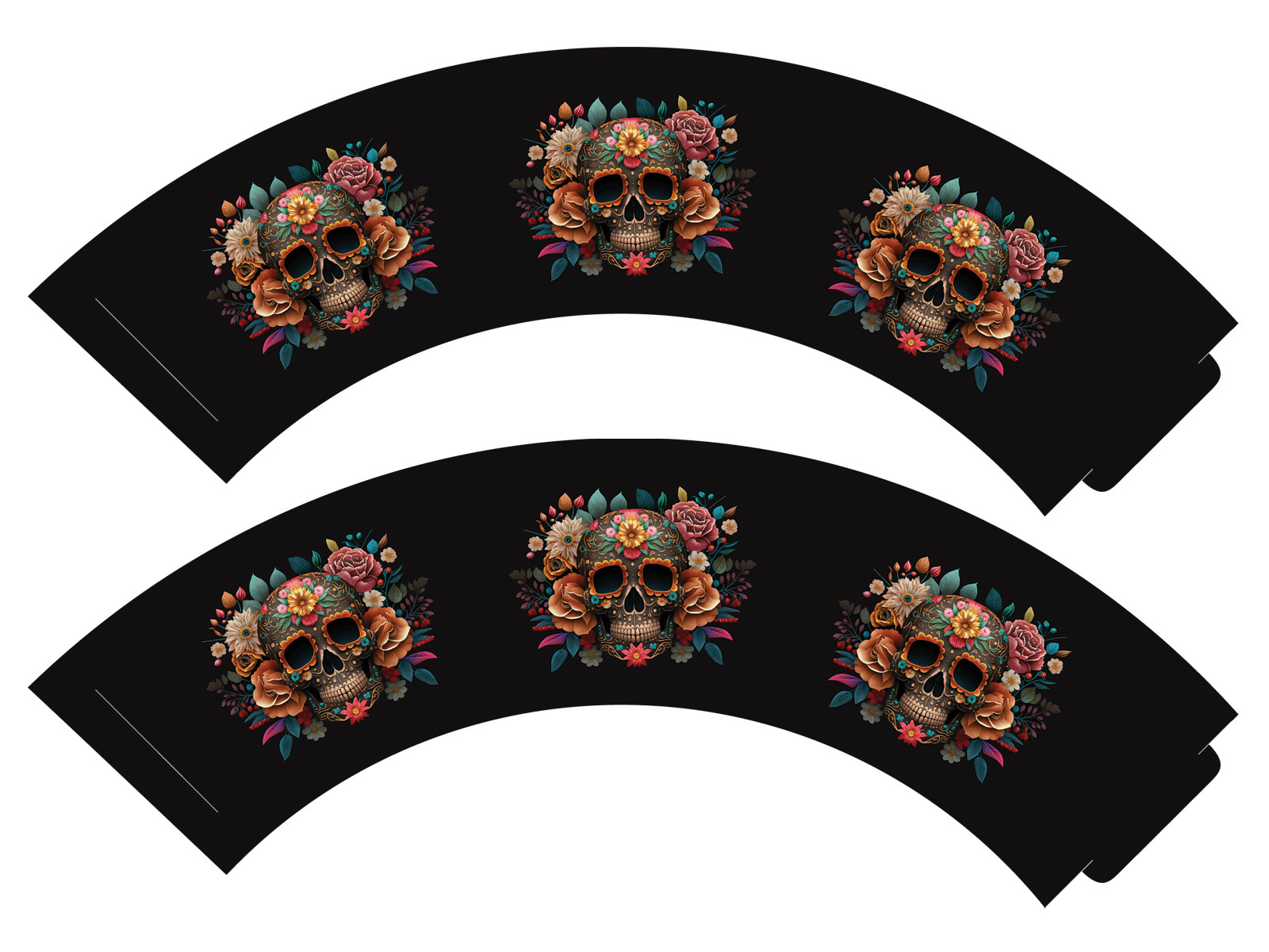 Papilotki na babeczki Dia de los Muertos - 6 szt. - Papilotki na muffinki z meksykańską czachą. Służą jako dekoracja foremki na babeczki. Wielkość po złożeniu: 5 x 7 x 5 cm.