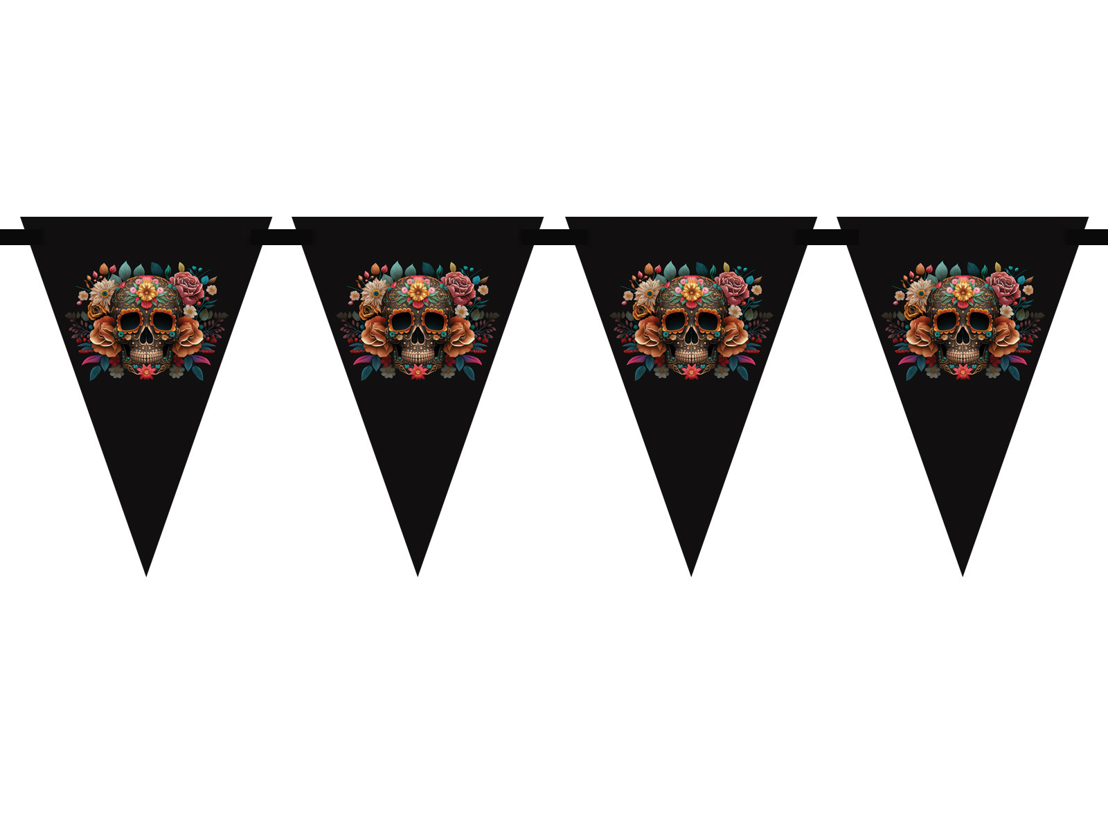 Baner flagi Dia de los Muertos - 500 cm - 1 szt. - Baner flagi z meksykańską czachą. Do baneru można dołączyć dowolny element, baner jest składany samodzielnie. Długość wstążki: 500 cm. Wysokość flagi: 15 cm. Opakowanie: 14 flag.