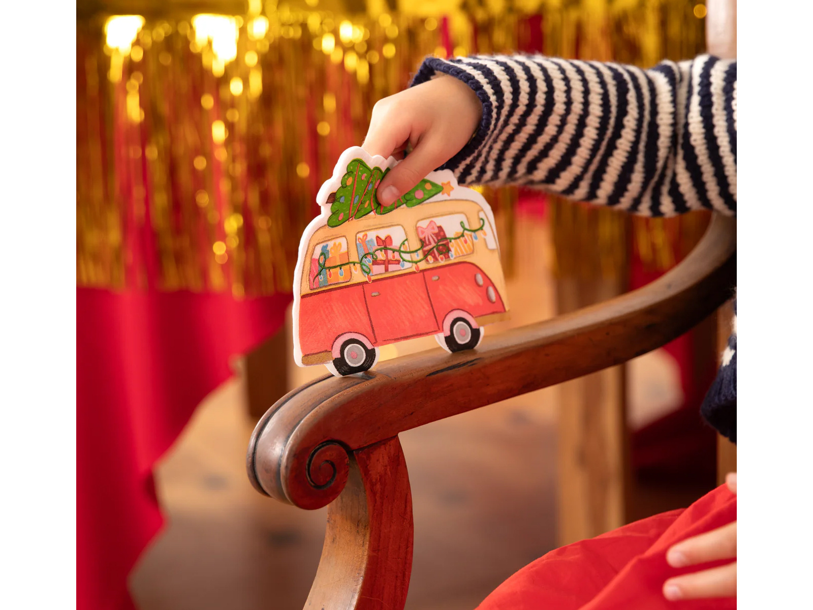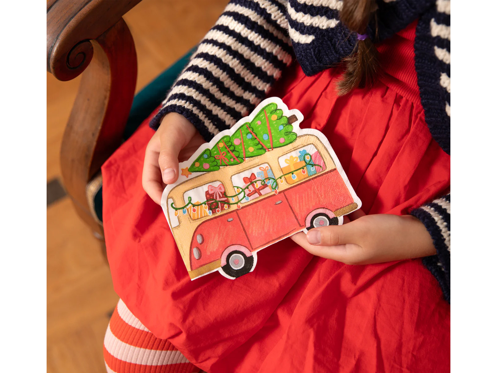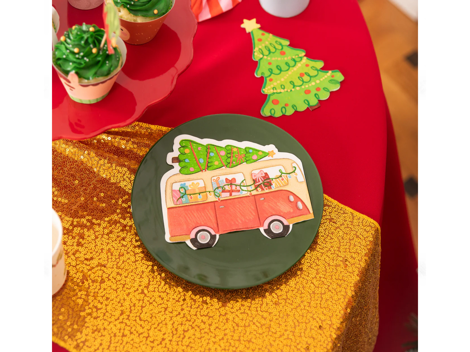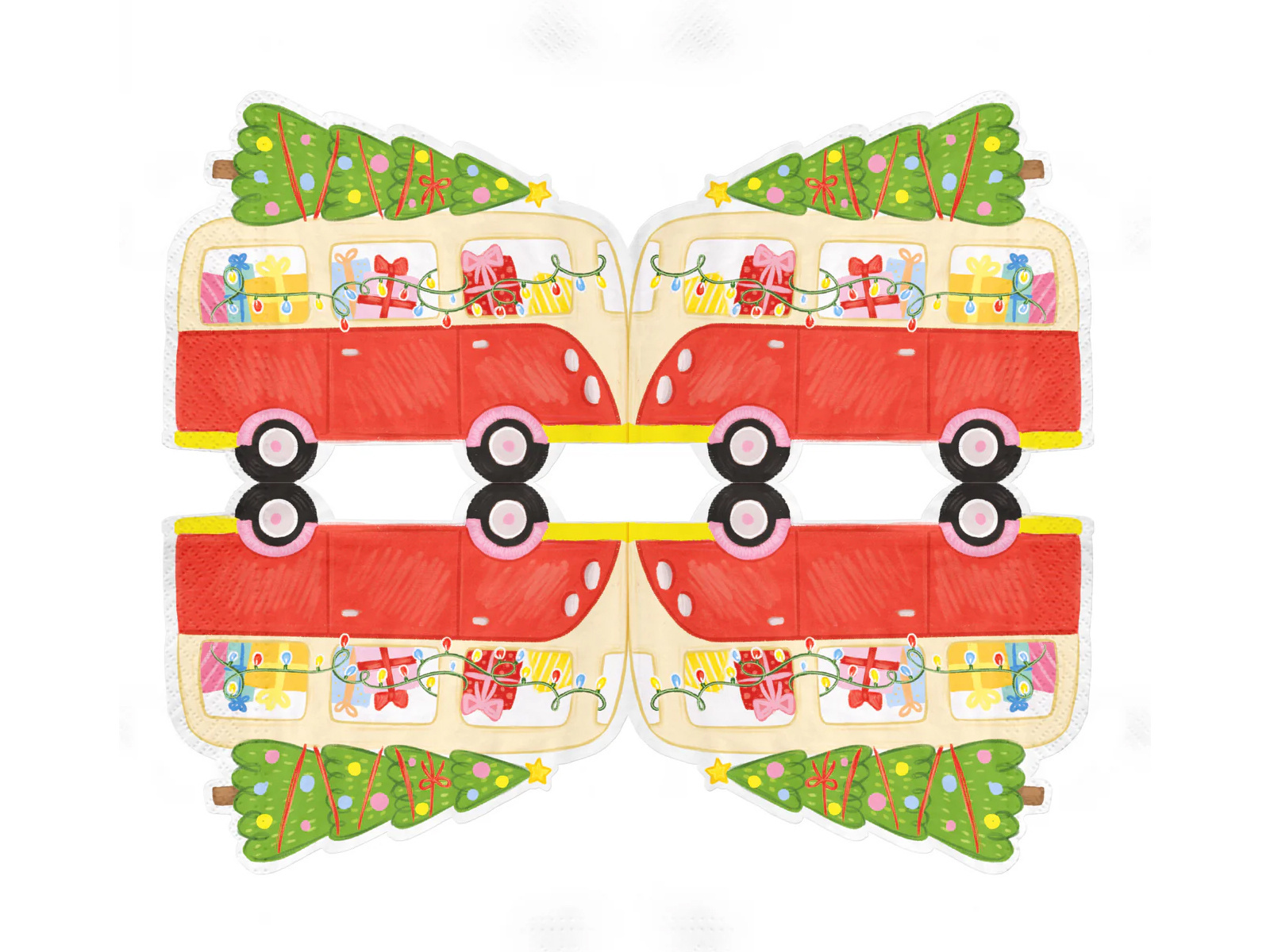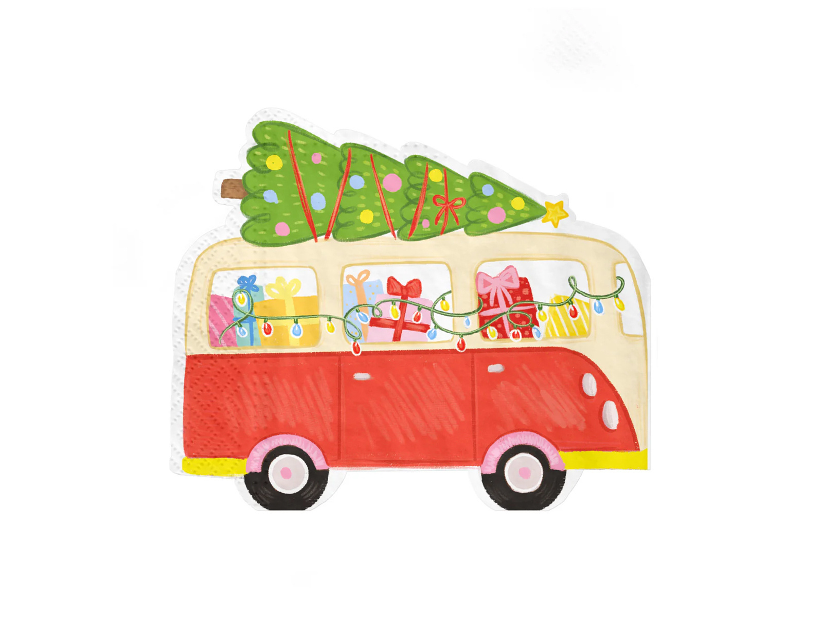 Zanurz swój stół w świątecznym klimacie dzięki wyjątkowym serwetkom "Autko z Choinką". Te oryginalnie zaprojektowane serwetki papierowe mają kształt busa, który jest wypełniony prezentami i wiozi na dachu świąteczną choinkę. Idealnie komponują się z każdym rodzajem świątecznej zastawy, dodając magicznego uroku do Twojego stołu.