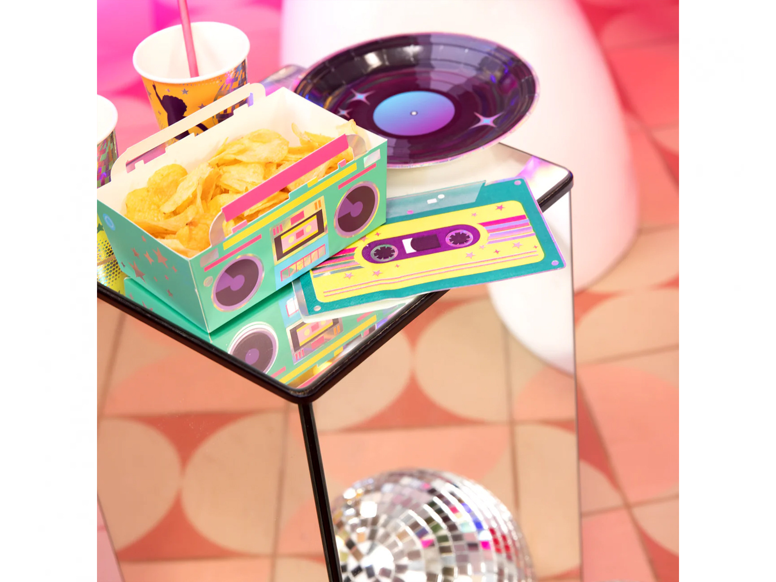 Zachwyć gości na swojej imprezie wyjątkowymi pudełkami na czipsy inspirowanymi erą Disco! Ten zestaw 6 papierowych pudełek w kształcie stylowych radioodbiorników z lat 60. to idealny sposób na serwowanie przekąsek na karnawały, urodziny, a także inne specjalne okazje.