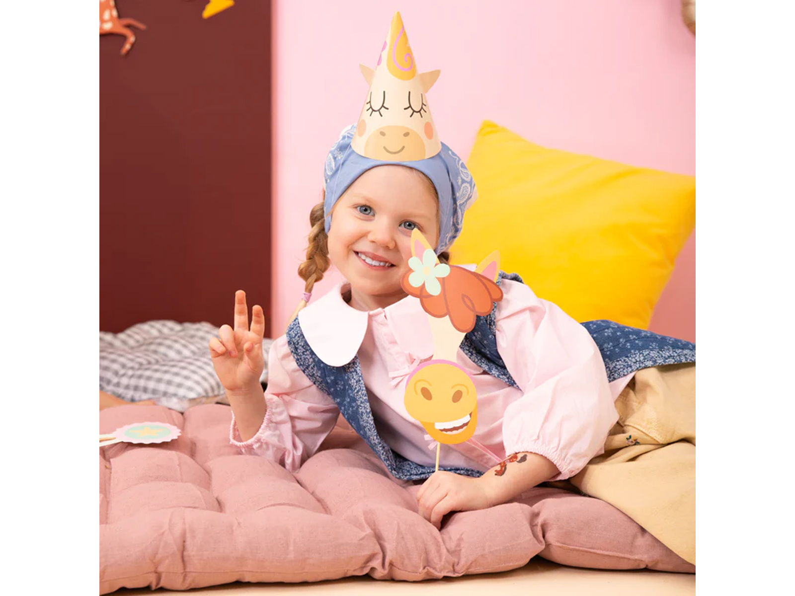 Organizujesz urodziny dla dziecka z tematyką bajkowych koników? Chcesz uchwycić wyjątkowe momenty podczas zabawy? Set 14 tekturowych foto rekwizytów Koniki to doskonały wybór, aby dodać kreatywnego charakteru każdej imprezie dla dzieci. Rekwizyty mają różne rozmiary od 11,5 cm do 24 cm, a długość patyczka wynosi około 20 cm, co umożliwia łatwe i wygodne użytkowanie przez dzieci.