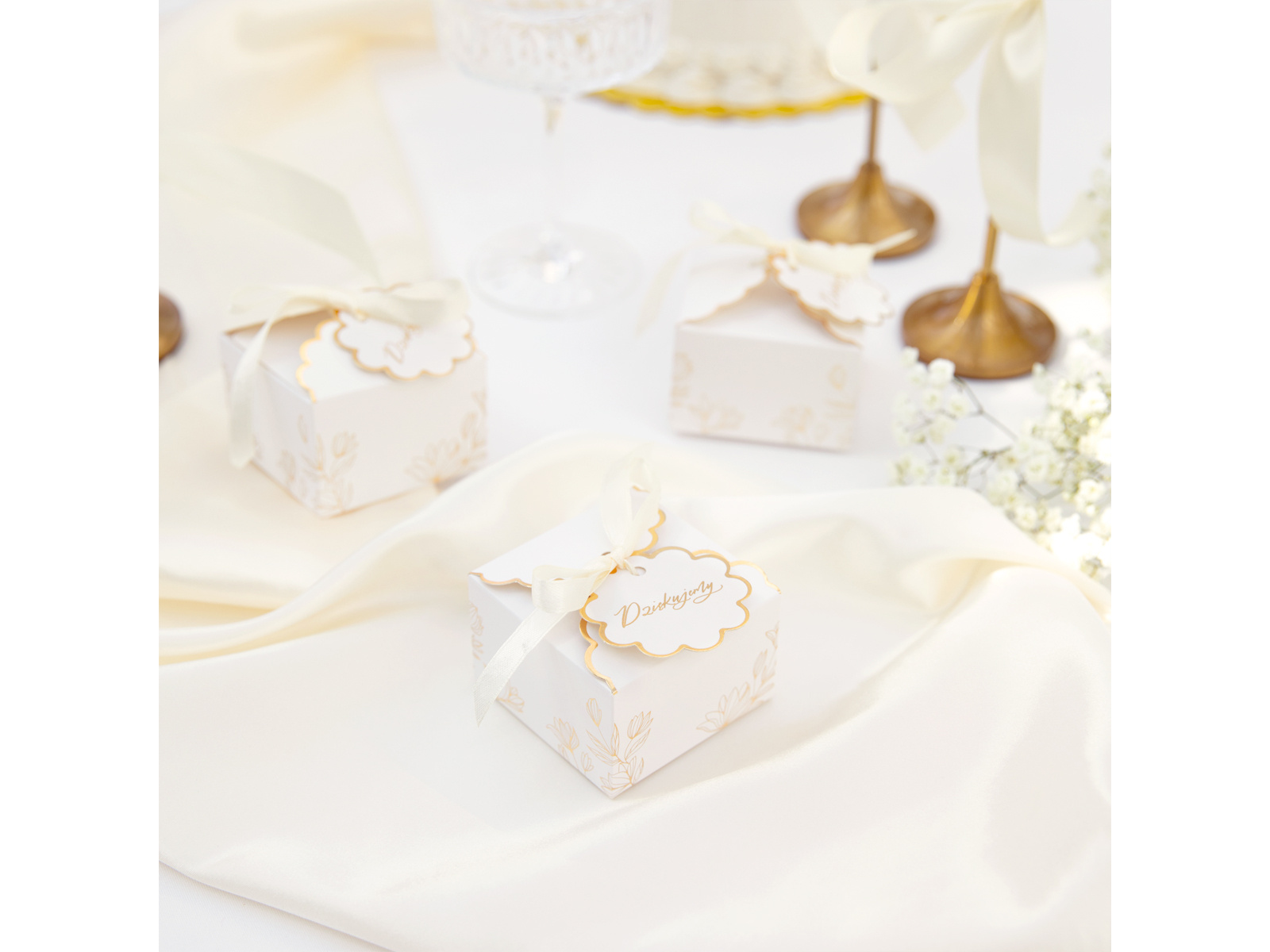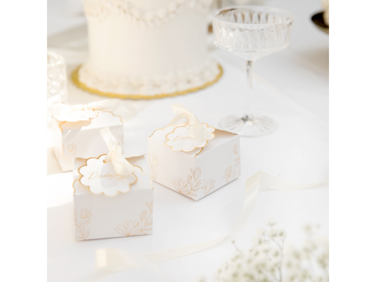 W zestawie: 10 pudełeczek, 10 etykiet, 10 wstążek o długości 39 cm.