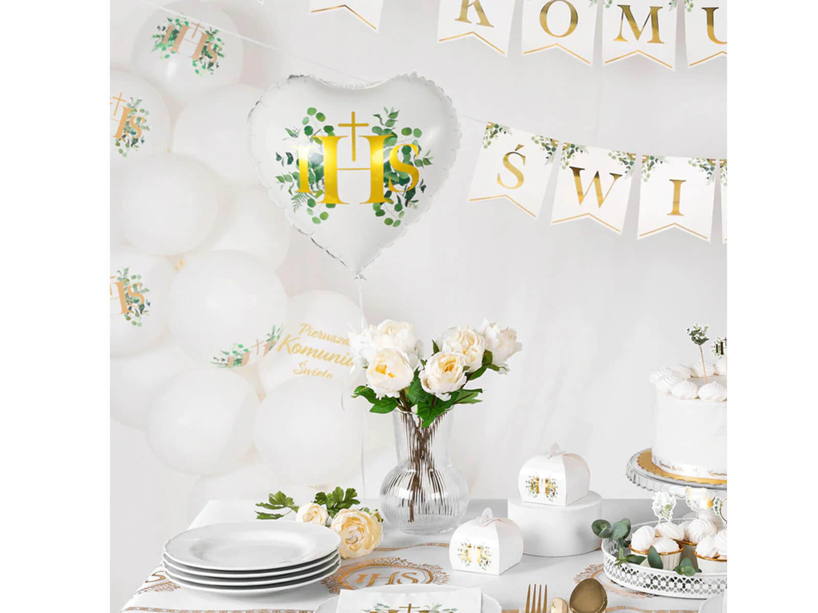 - lateksowe biodegradowalne białe z nadrukiem gałązek eukaliptusa oraz złotym metalizowanym napisem IHS - 30 cm (3 szt.),