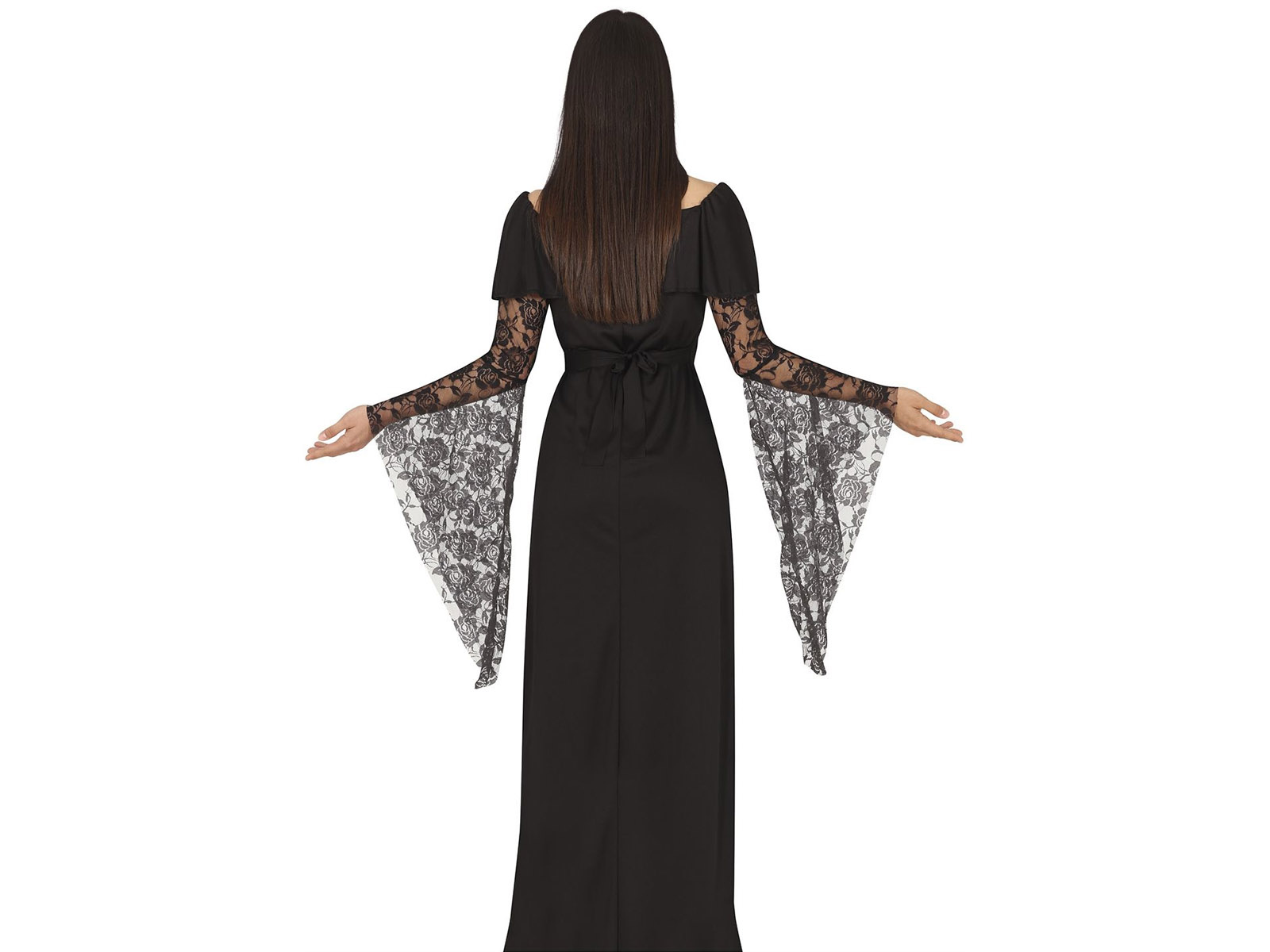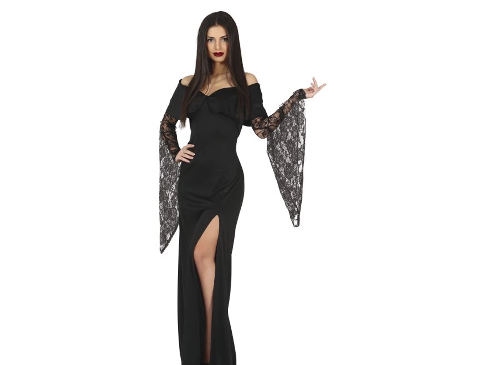 W komplecie: długa, czarna sukienka z rozkloszowanymi rękawami.