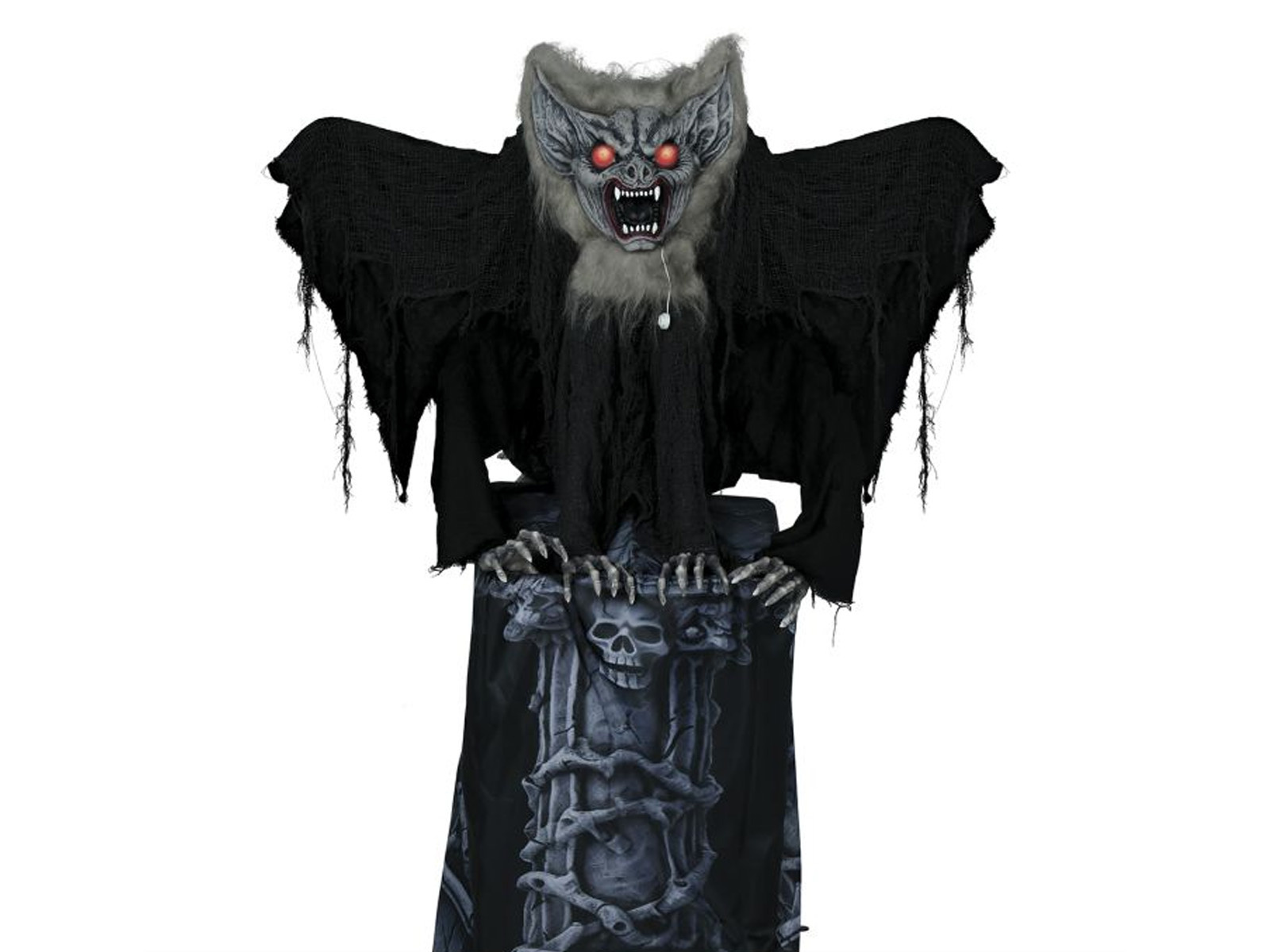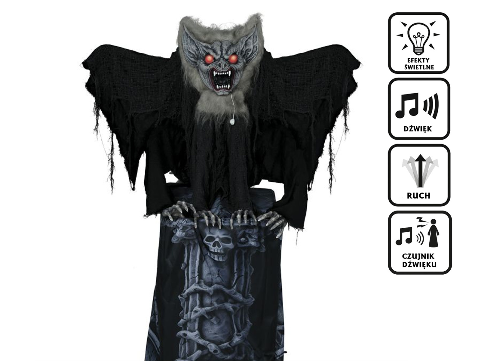 Przekształć swoje przyjęcie w Halloween w prawdziwą scenę z horroru dzięki naszemu Nagrobkowi z Przerażającym Nietoperzem. Ta pełnowymiarowa dekoracja, osiągająca 150 cm wysokości, to gwarancja dreszczyku emocji wśród Twoich gości. Nietoperz nie tylko wykonuje straszne ruchy, ale jego przerażające, świecące się oczy i wydobywające się dźwięki zwiększą napięcie podczas Halloweenowej nocy.