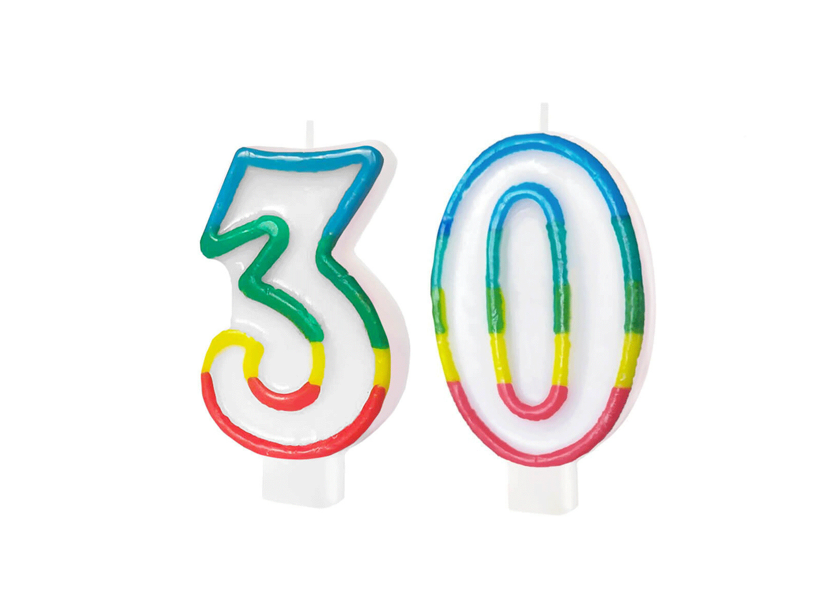 Świeczki cyferki z kolorową obwódką cyfra 30 - 8,5 cm - 2 szt.