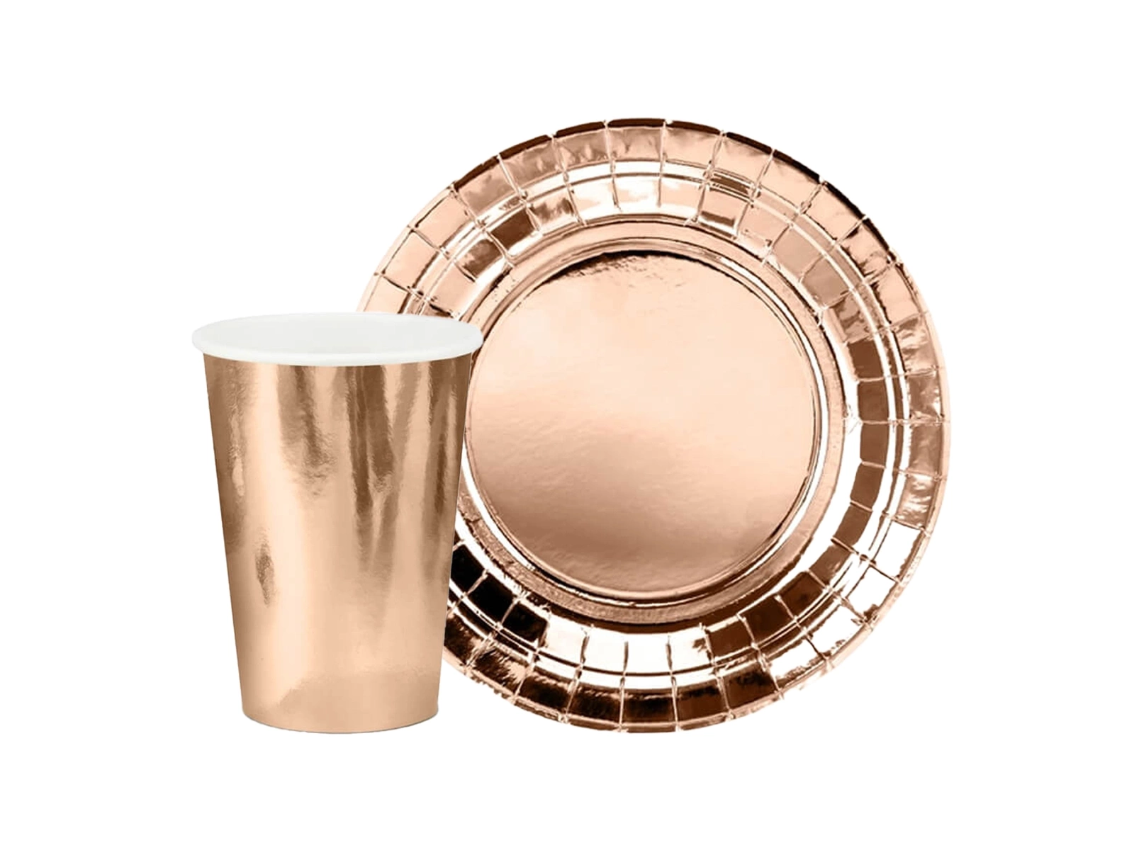 Zestaw kubeczki + talerzyki papierowe różowo-złote - 24 szt.