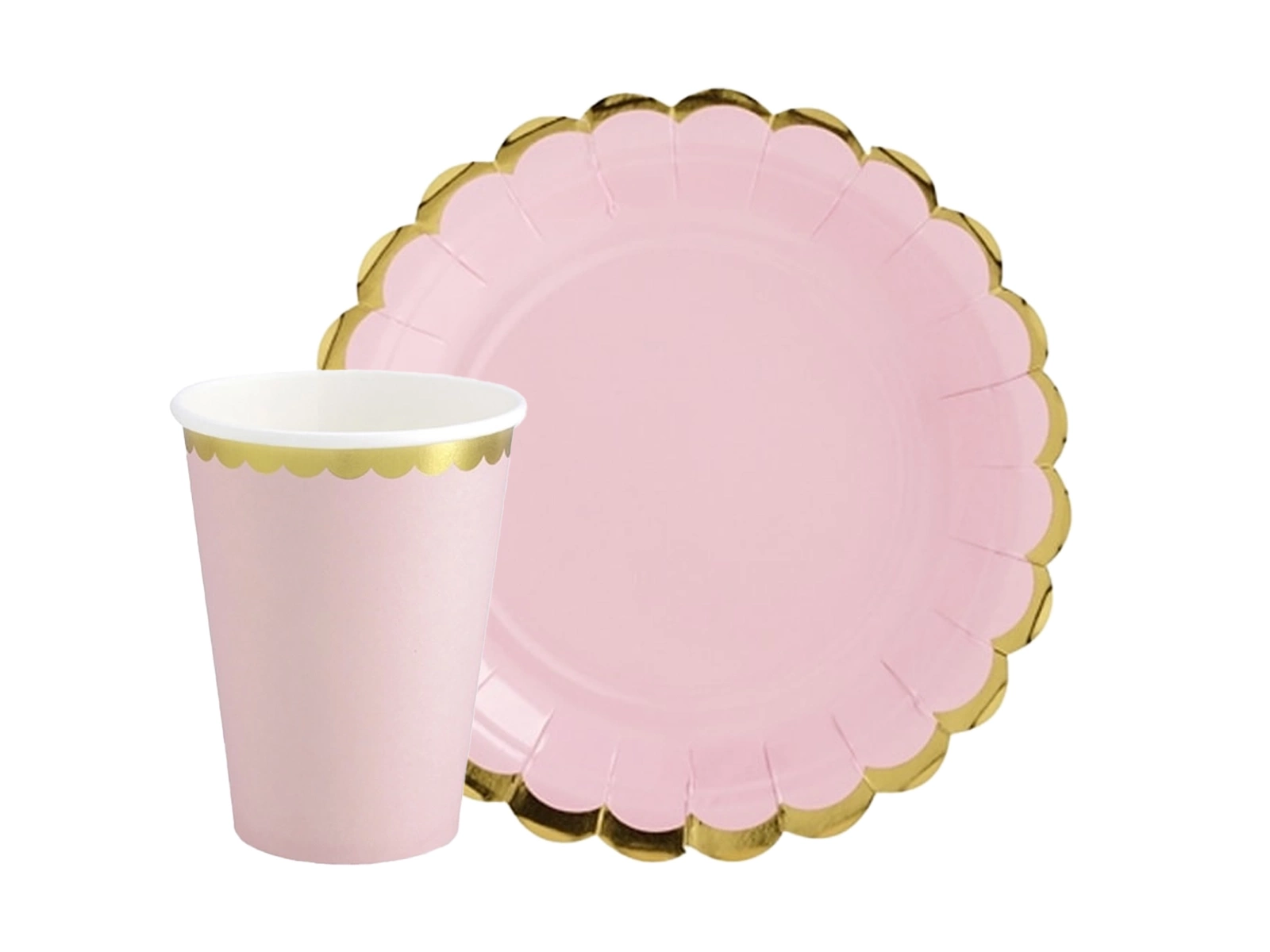 Zestaw kubeczki + talerzyki papierowe w kolorze różowym ze złotem - 24 szt.