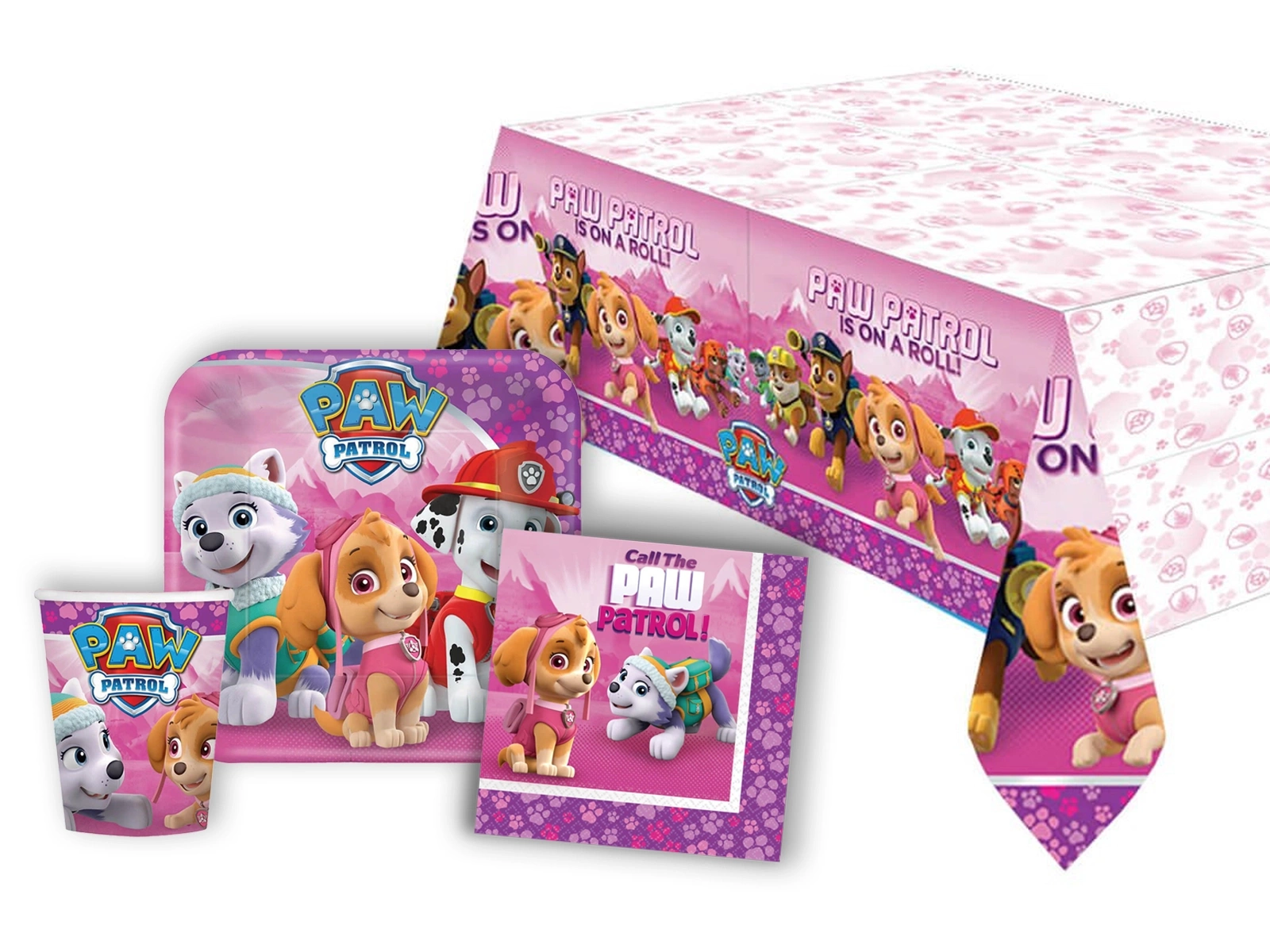 Zestaw kubeczki, talerzyki i serwetki papierowe + obrus na urodziny Psi Patrol - 37 szt.