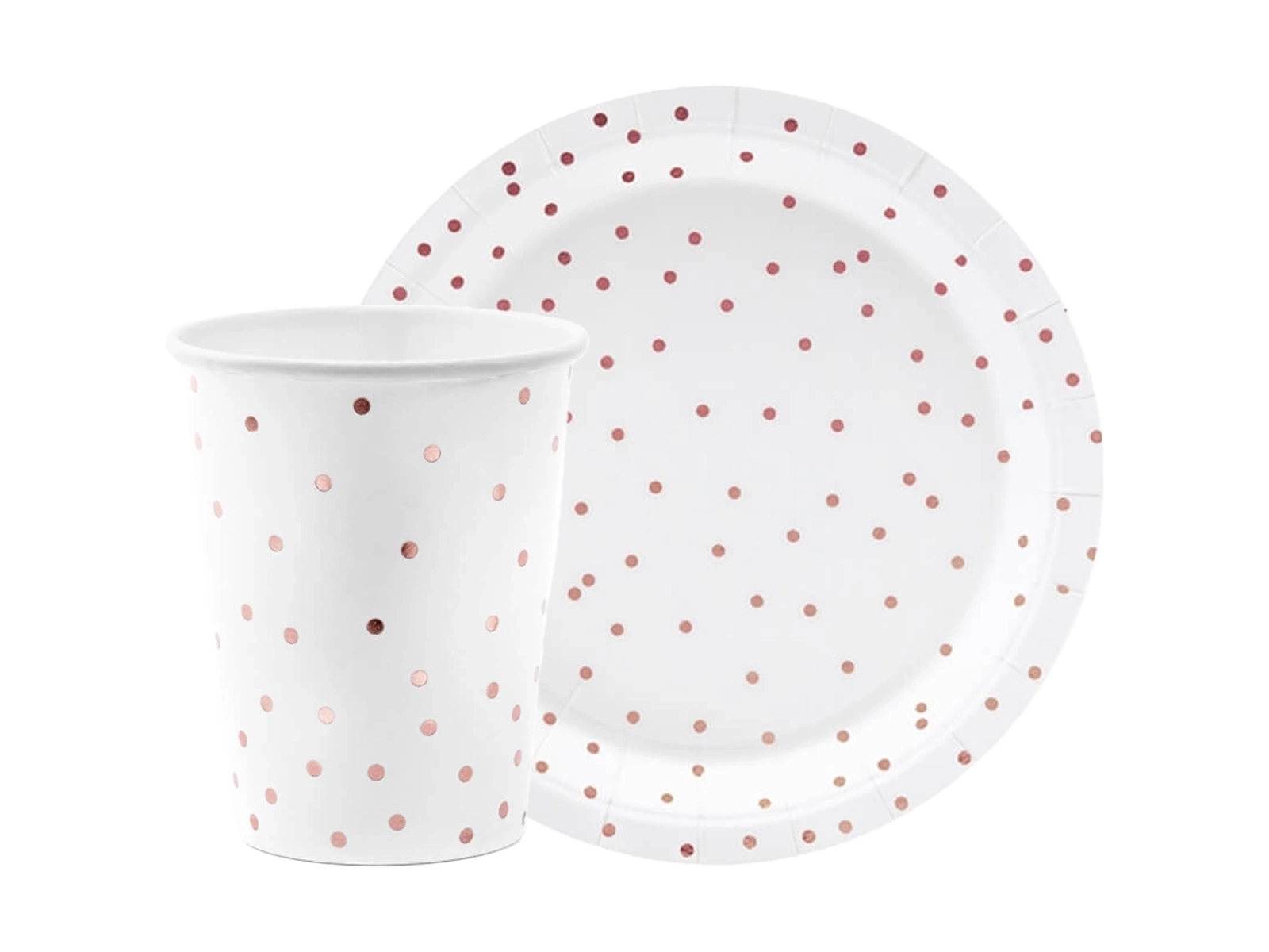 Zestaw kubeczki + talerzyki papierowe Kropki białe - 24 szt.