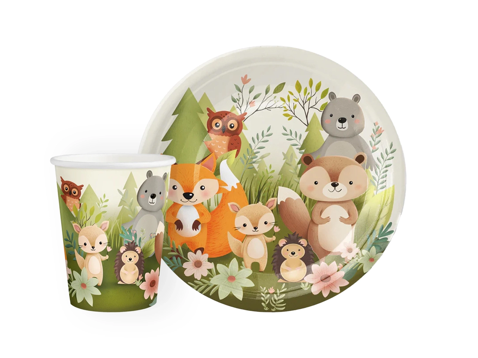 Zestaw kubeczki + talerzyki papierowe Leśni przyjaciele - 12 szt.