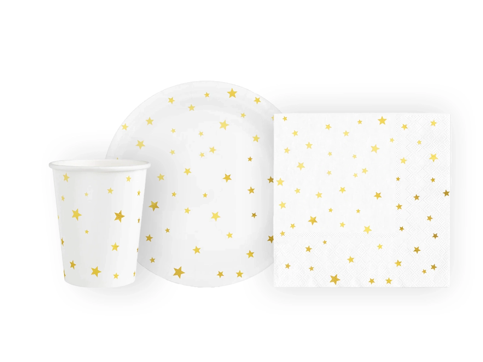 Zestaw kubeczki + serwetki + talerzyki papierowe białe w złote gwiazdki - 22 szt.