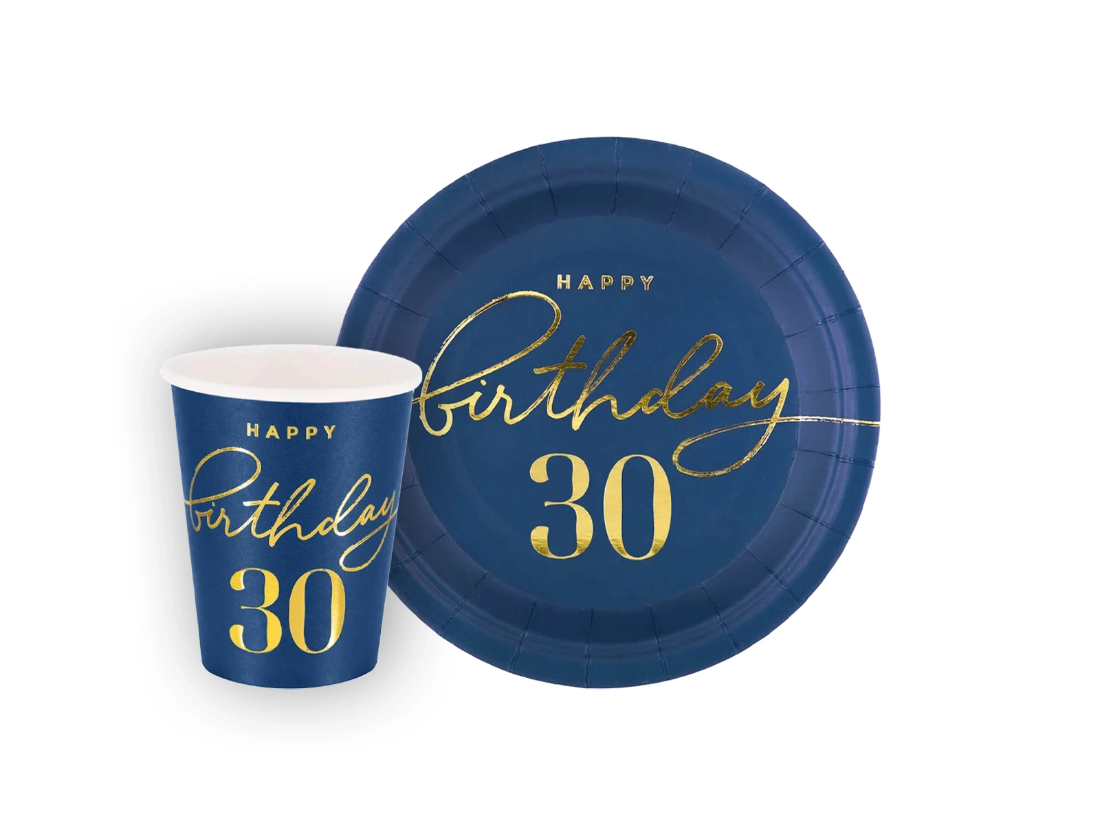 Zestaw kubeczki + talerzyki papierowe na 30ste urodziny granatowe - 12 szt.