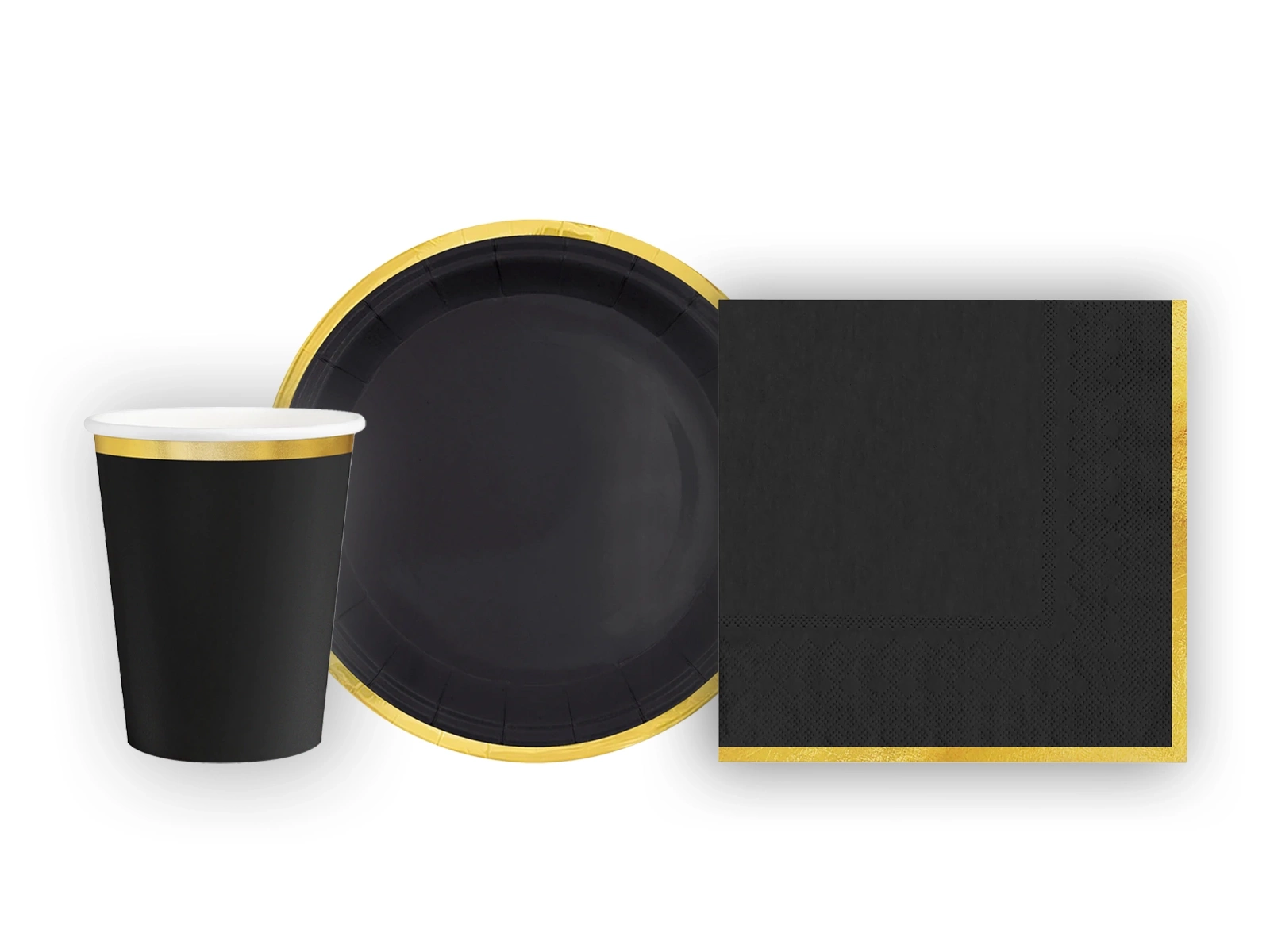 Zestaw kubeczki + serwetki + talerzyki papierowe czarne ze złotymi brzegami - 22 szt.
