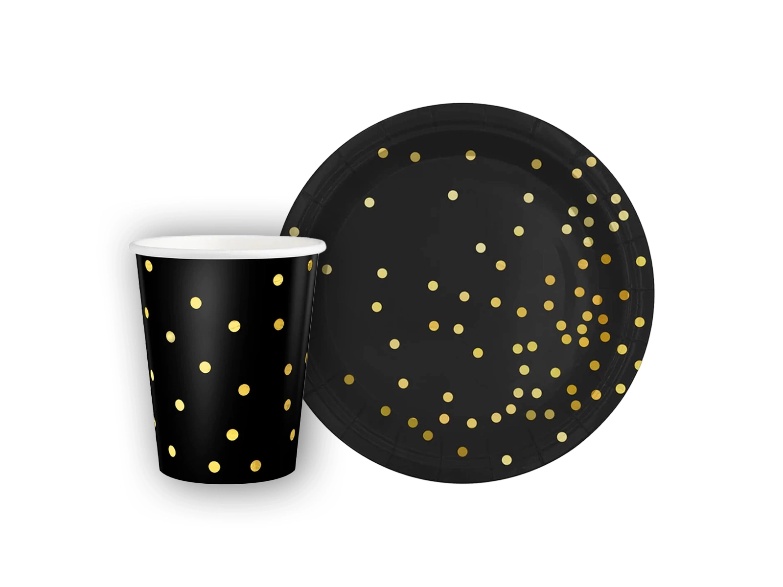 Zestaw kubeczki + talerzyki papierowe czarne w złote kropki - 12 szt.