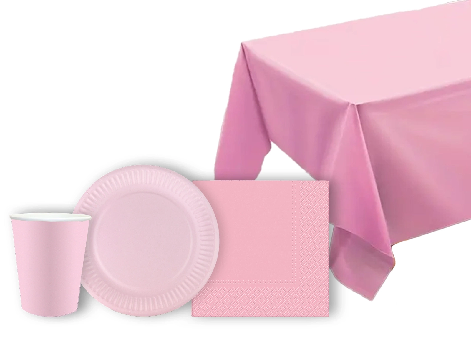 Zestaw obrus + kubeczki + serwetki + talerzyki papierowe różowe - 45 szt.