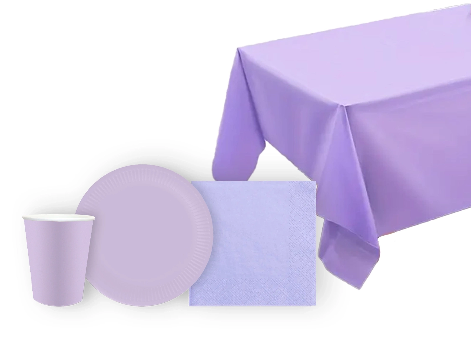 Zestaw obrus + kubeczki + serwetki + talerzyki papierowe fioletowe - 45 szt.