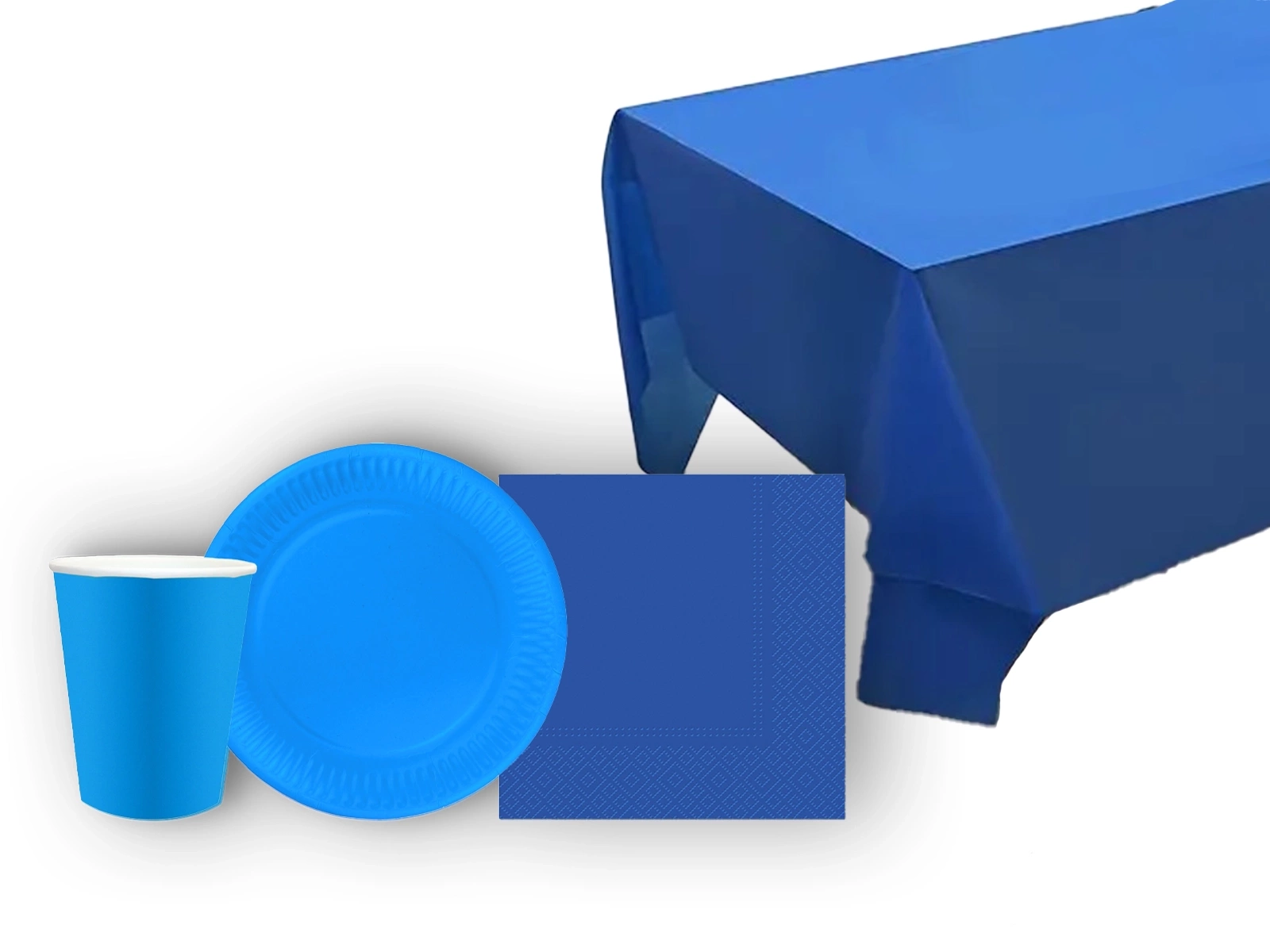 Zestaw obrus + kubeczki + serwetki + talerzyki papierowe niebieskie - 45 szt.