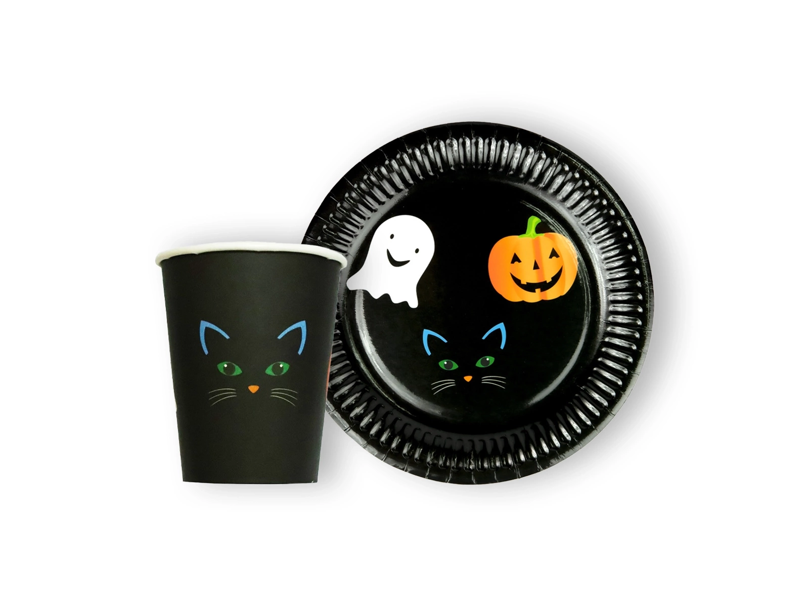 Zestaw kubeczki i talerzyki papierowe na Halloween Duch Kot Dynia - 24 szt.