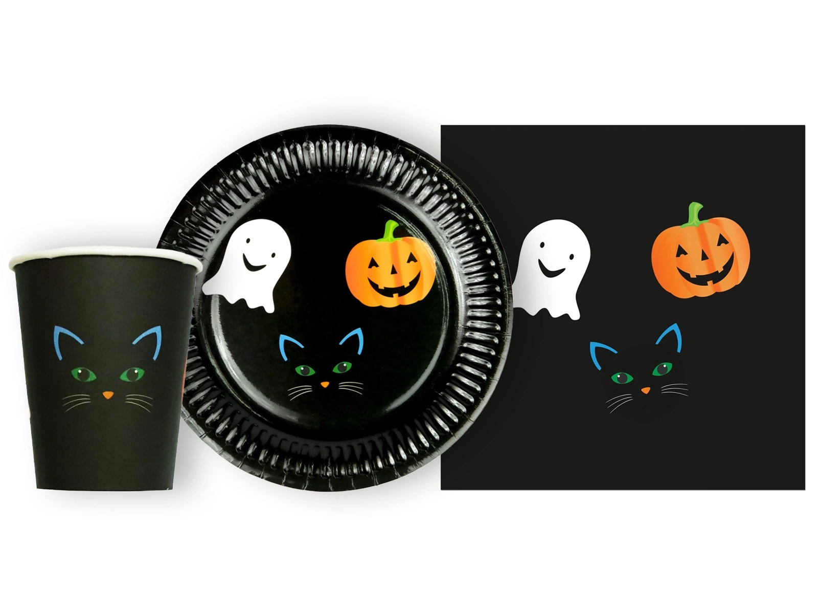 Zestaw kubeczki, serwetki i talerzyki papierowe na Halloween Duch Kot Dynia - 44 szt.