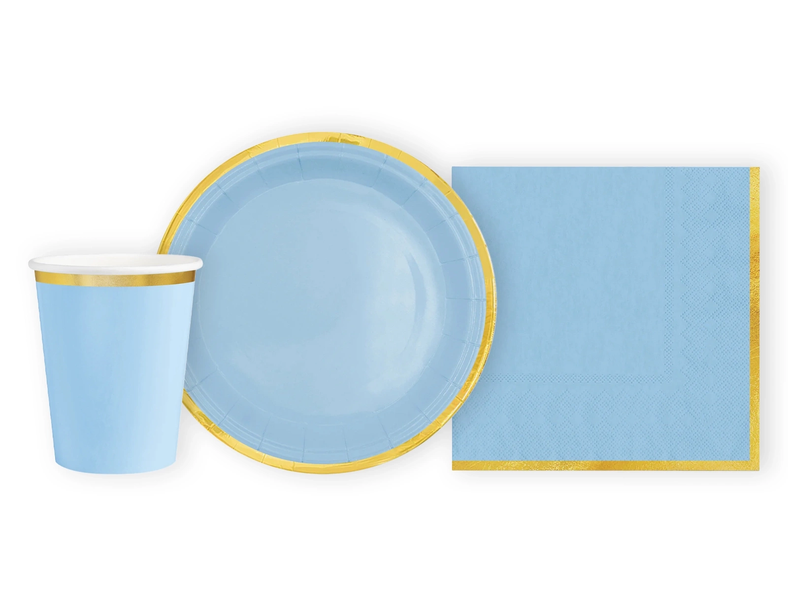 Zestaw kubeczki + serwetki + talerzyki papierowe niebieskie ze złotym brzegiem - 22 szt.