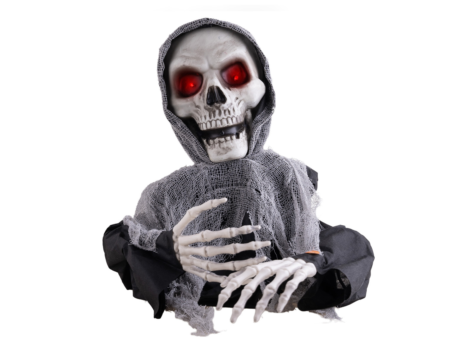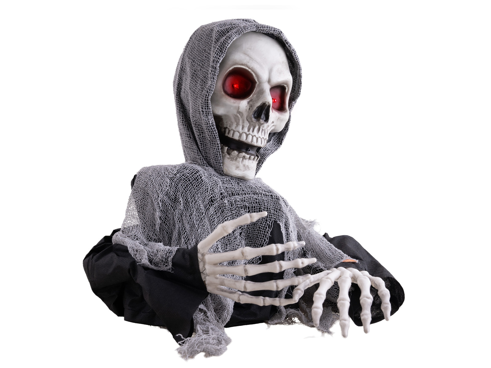 Posiada czujniki dźwięku, czyli np. po klaśnięciu głowa oraz ramiona dekoracji zaczynają się poruszać, uruchamiają się efekty dźwiękowe i świetlne.