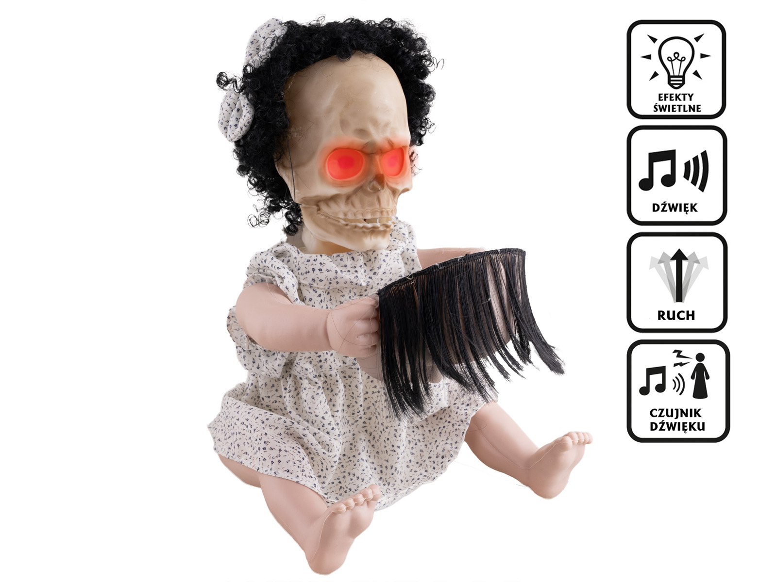 Posiada czujniki dźwięku oraz ruchu, czyli np. po klaśnięciu lub przejściu obok, dekoracja zaczyna się ruszać oraz uruchamiają się efekty świetlne i dźwiękowe.