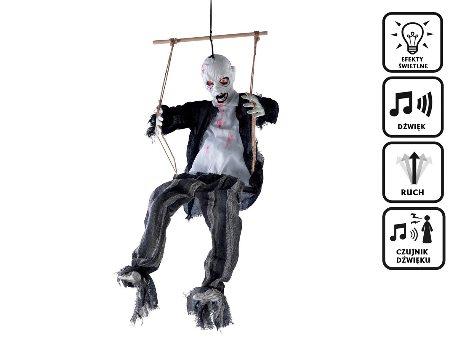 Posiada czujniki dźwięku oraz ruchu, czyli np. po klaśnięciu lub przejściu obok, dekoracja zaczyna się ruszać oraz uruchamiają się efekty świetlne i dźwiękowe.